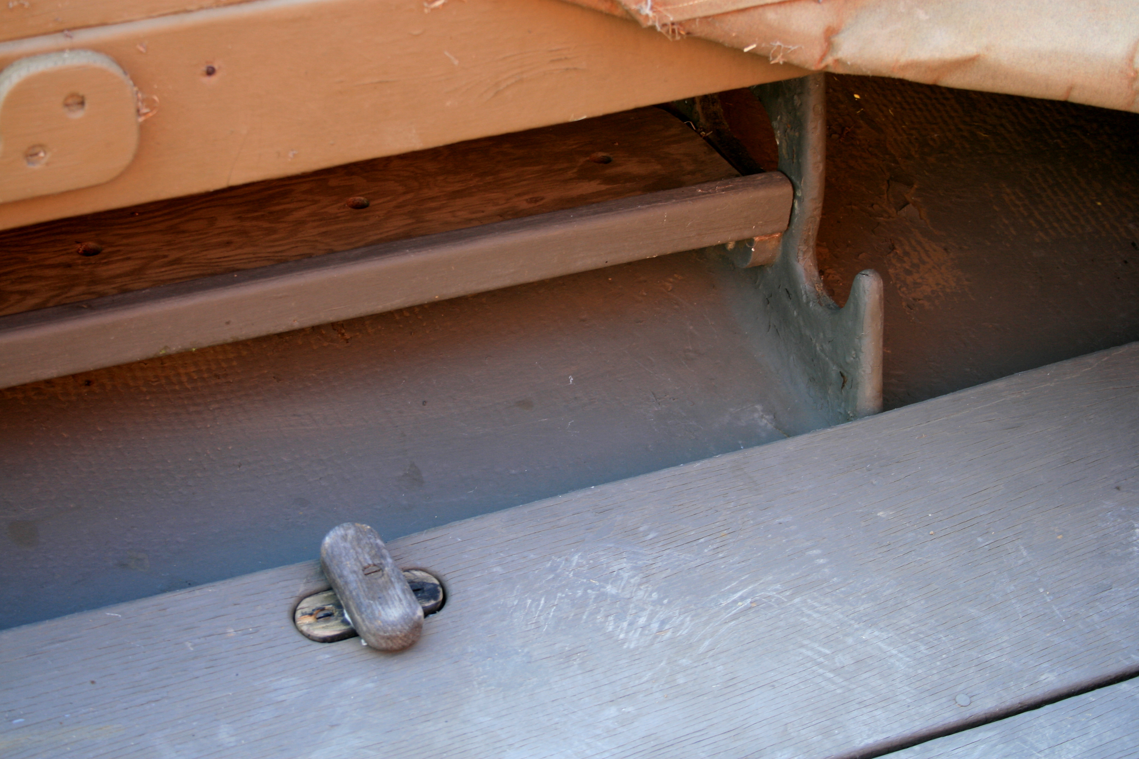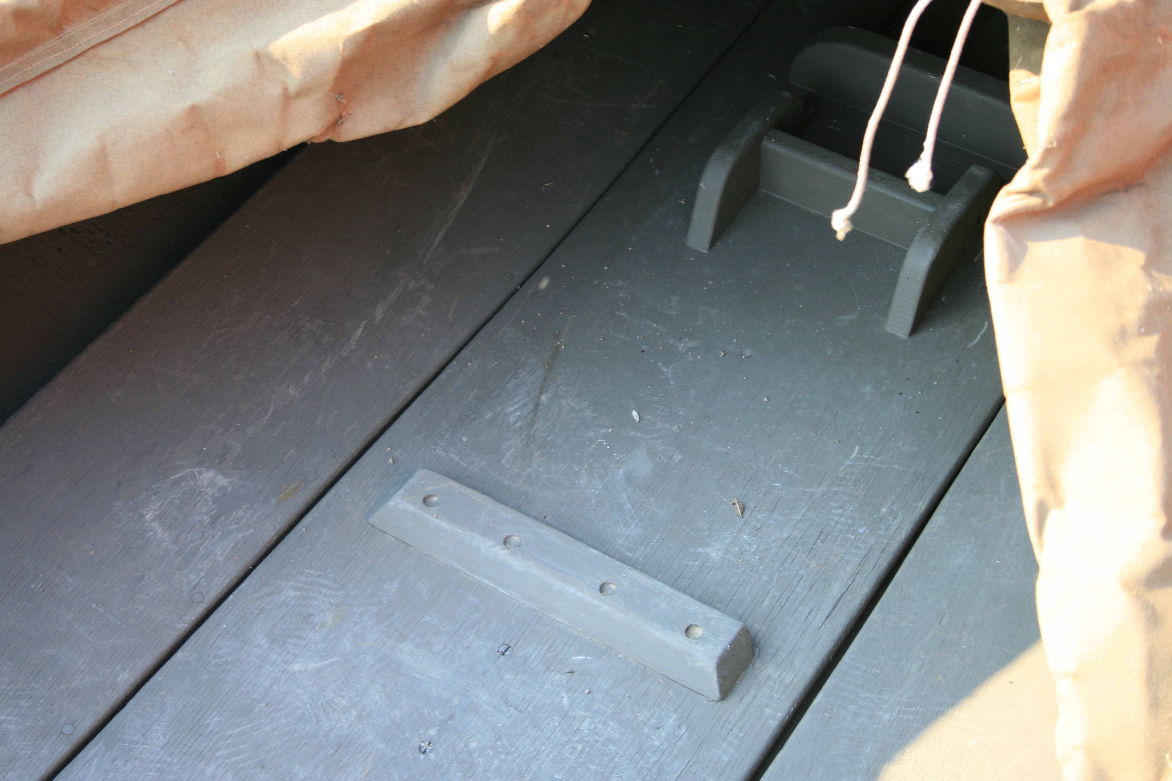 There are 3 plywood floorboards. The middle one is screwed – and set in 3M 5200 – permanently to the center stringer. The outer ‘boards are removable. They fit under the middle ‘board with a full-length wooden flange and are held in place with a single White Oak turnbutton apiece. These photos also show the shelf, the racks to store the oars, and the chock – fastened to the inside of the coaming – to hold the “lap canvas” – a thatched cover to hide your legs and chest while laying in wait.