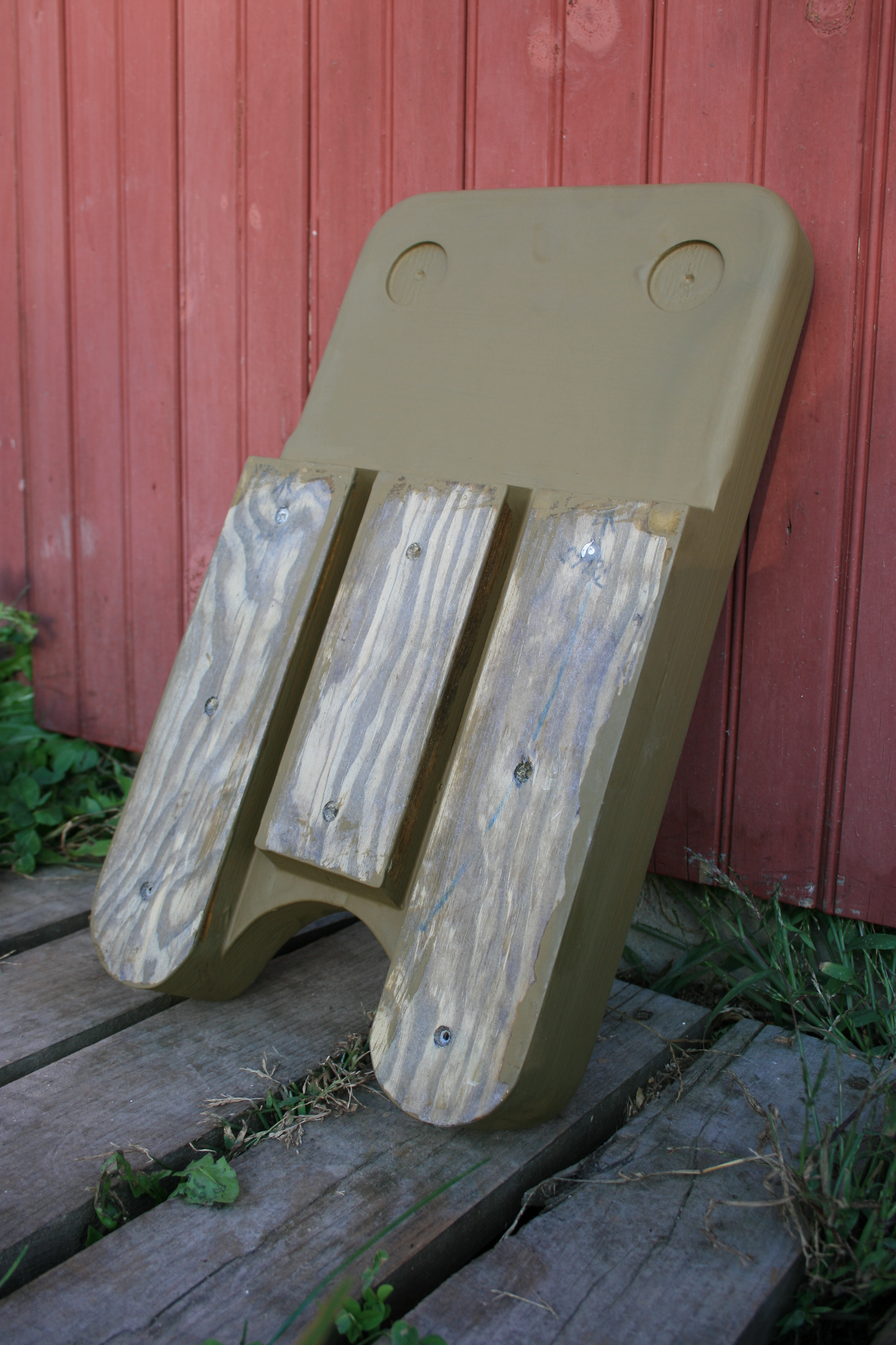 Here is the new (2012) motorboard. The spacers accommodate the lip formed by the deck-hull joint. I bore shallow holes into the motorboard to keep the screw clamps in place – and, yes, I did lose a motor once on a transom that did not have this feature. The outboard is a 9.9 Evinrude – circa 1999.