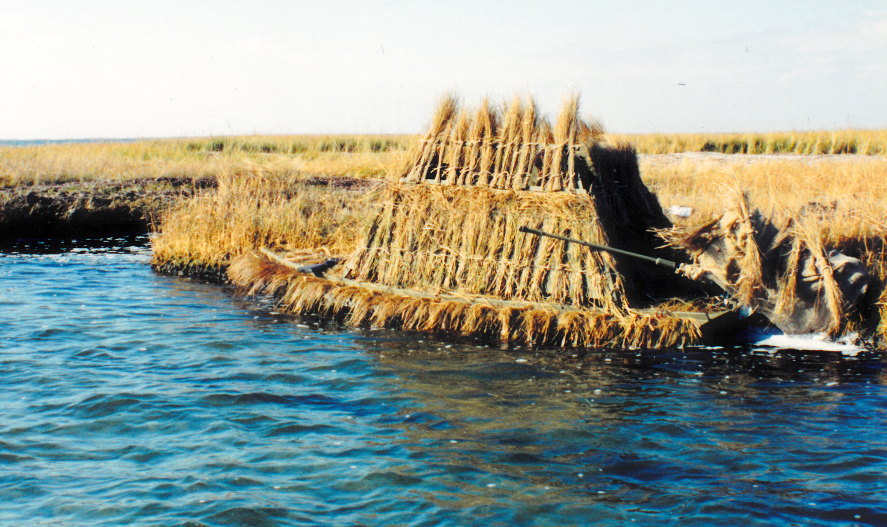 Here is how I gun her – all thatched up with a mix of Salt Hay and Cordgrass. The spray dodger is down, the lap canvas is in place, and the motor cover is on. Note how the pushpole stows in its chock and bail.