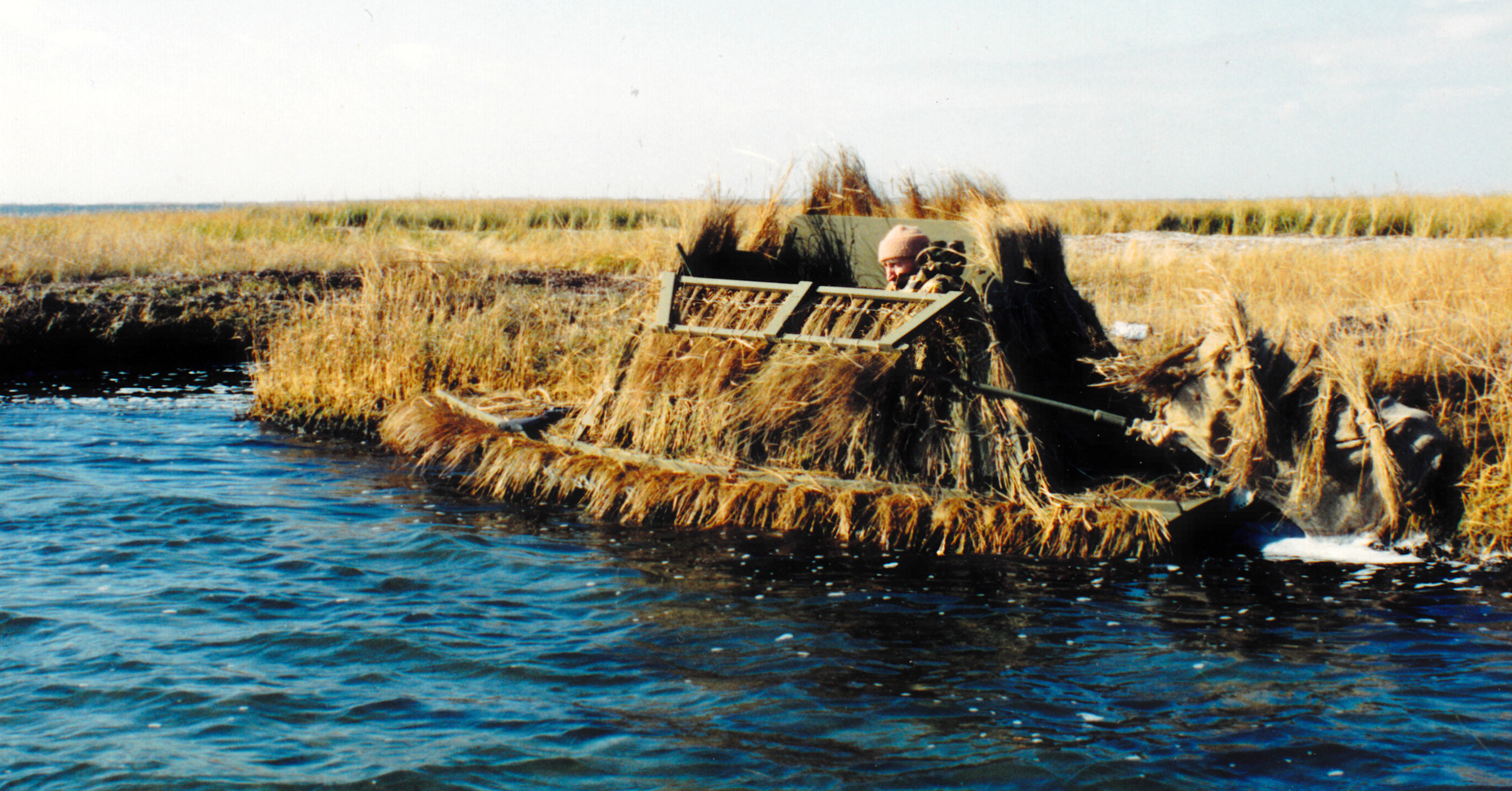 With some ‘glass and resin and plywood, I repaired a few major breaks in the hull, refastened the deck to the hull in several places and then set to work fitting her out for more days on the marsh. I built and installed floorboards, shelves, the motorboard, thatch rails and oarlock stanchions. I then sewed up a spray dodger, a cockpit cover (for storage and transport) and a lap cover (for gunning). Finally, I poured plenty of 2-part urethane foam into the bow. These pictures show her as I gunned her for several years before I moved from Long Island in 1995.
