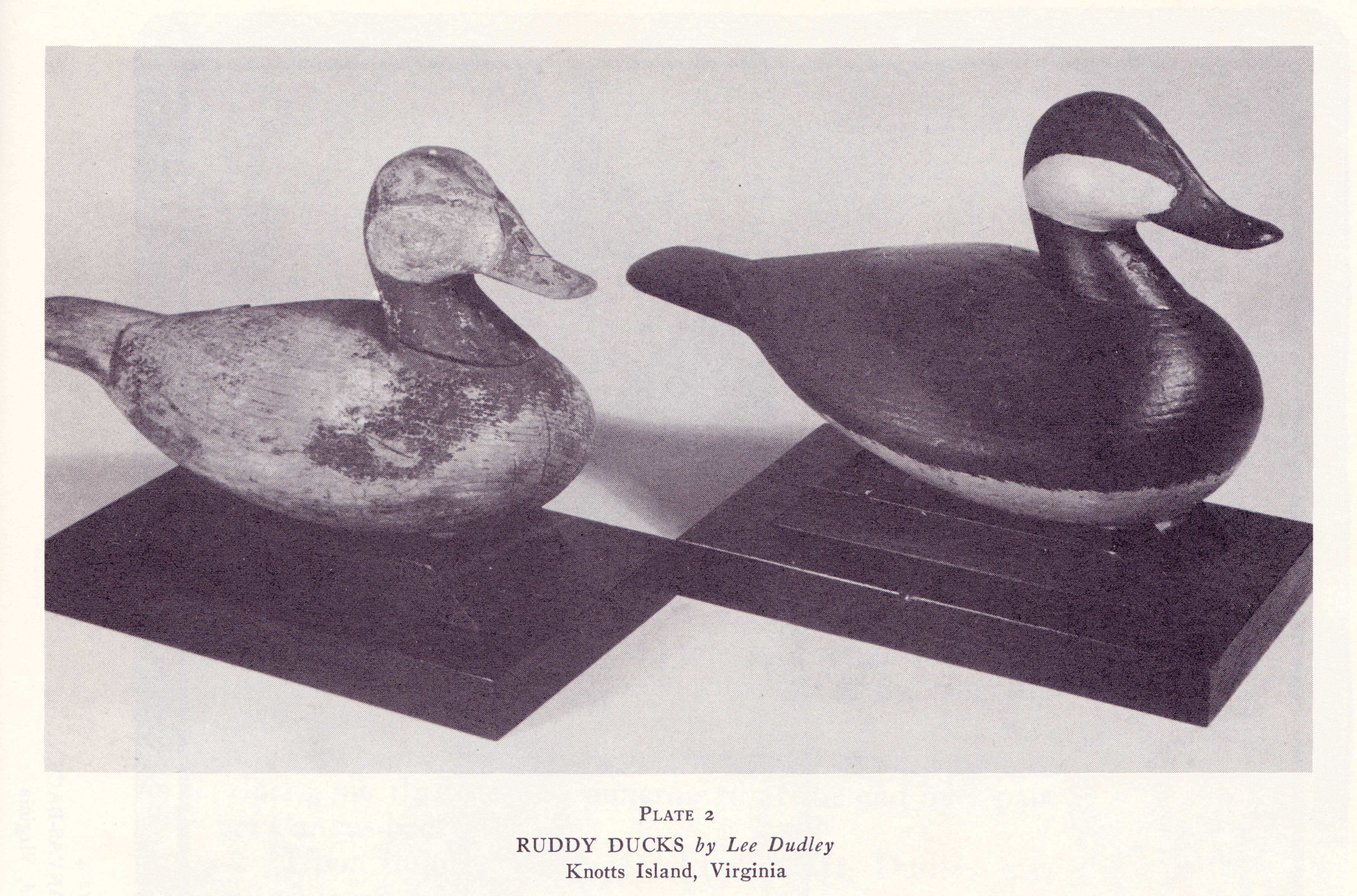 But, it was Joel Barber’s Wild Fowl Decoys that set me on a path toward carving. I did not own a copy for many years but, when I first brought it home from the East Islip Public Library, I was smitten. Of course – like almost everyone who is drawn to the floating wooden sculpture we call decoys – I was transfixed by the two decoys in Plate 2. Ruddy Ducks by Lee Dudley, Knotts Island, Virginia. To my eye, both the worn bird on the left and the tarted-up, fresh paint bird on the right are perfect objects – they do what a decoy should do and nothing at all should be changed. These images are with me every time I carve and paint.