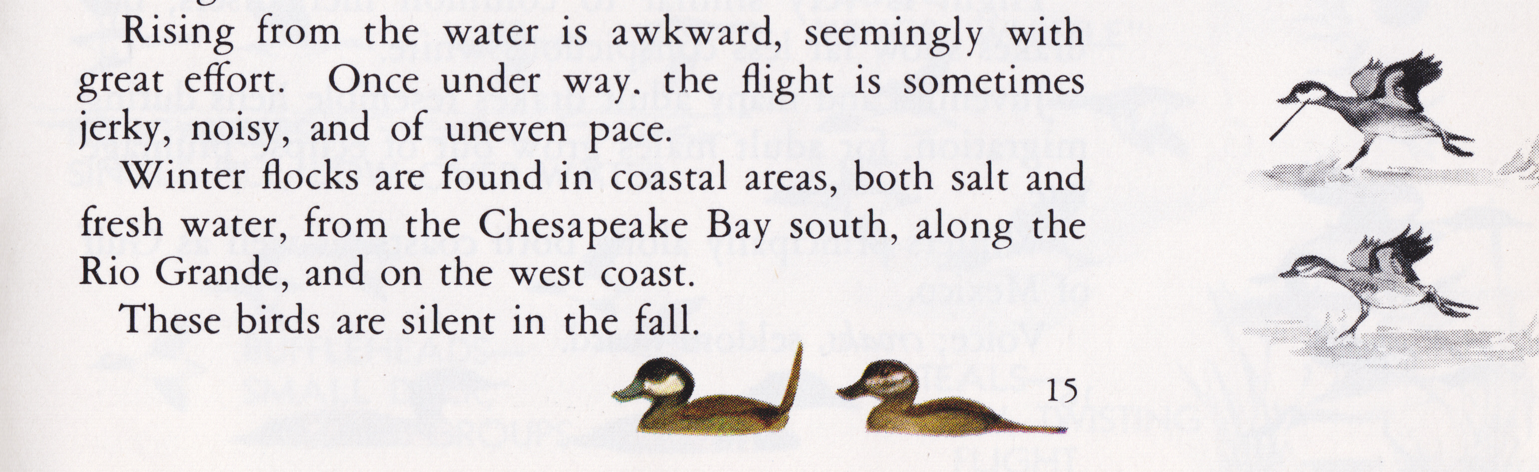 Later – it was first published when I was 10 – came Ducks at a Distance – the ID booklet published by Interior in 1963. I still like the original, green-covered version best. It was Bob Hines’ drawings and paintings that grabbed me. I probably copied most of them – often more than once – when I was a kid. His depiction on page 15 of the Ruddy taxiing over the water was one I drew and painted and inked.