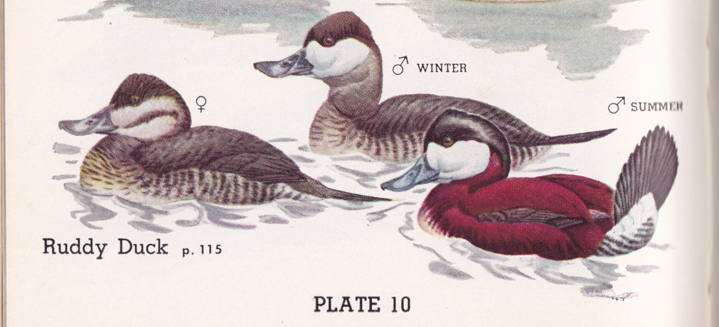 However, the image of the Ruddy is burned into my mind’s eye – and has been from an early age. Three “great books” guided my development as a budding bird artist and biologist – and later carver. First was the Audubon Water Bird Guide. I think many gunners of my generation – I was born in 1953 and the book was first published in 1951 – learned about ducks and geese from this book. Although the dust jacket is now long gone, I can still recall clearly the details from the first edition. Against a blue background was the lower portion of Plate 10 – Don Eckleberry’s fine painting of 3 Ruddies, the hen and the drake – the latter in both winter and summer plumages.