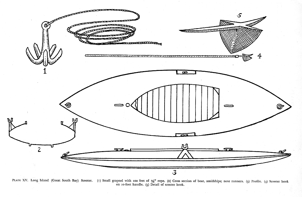 The basic difference between Great South Bay Scooters and Barnegat Bay Sneakboxes is the shape of the hull sections. The Scooters are U-shaped – flat-floored between the ice runners, whereas the Sneakboxes are round-floored – an arc of a circle. The Scooter was built for ice work and gets its name from being able to “scoot” so handily over the ice. I have a Scooter and a Sneakbox and enjoy them both.