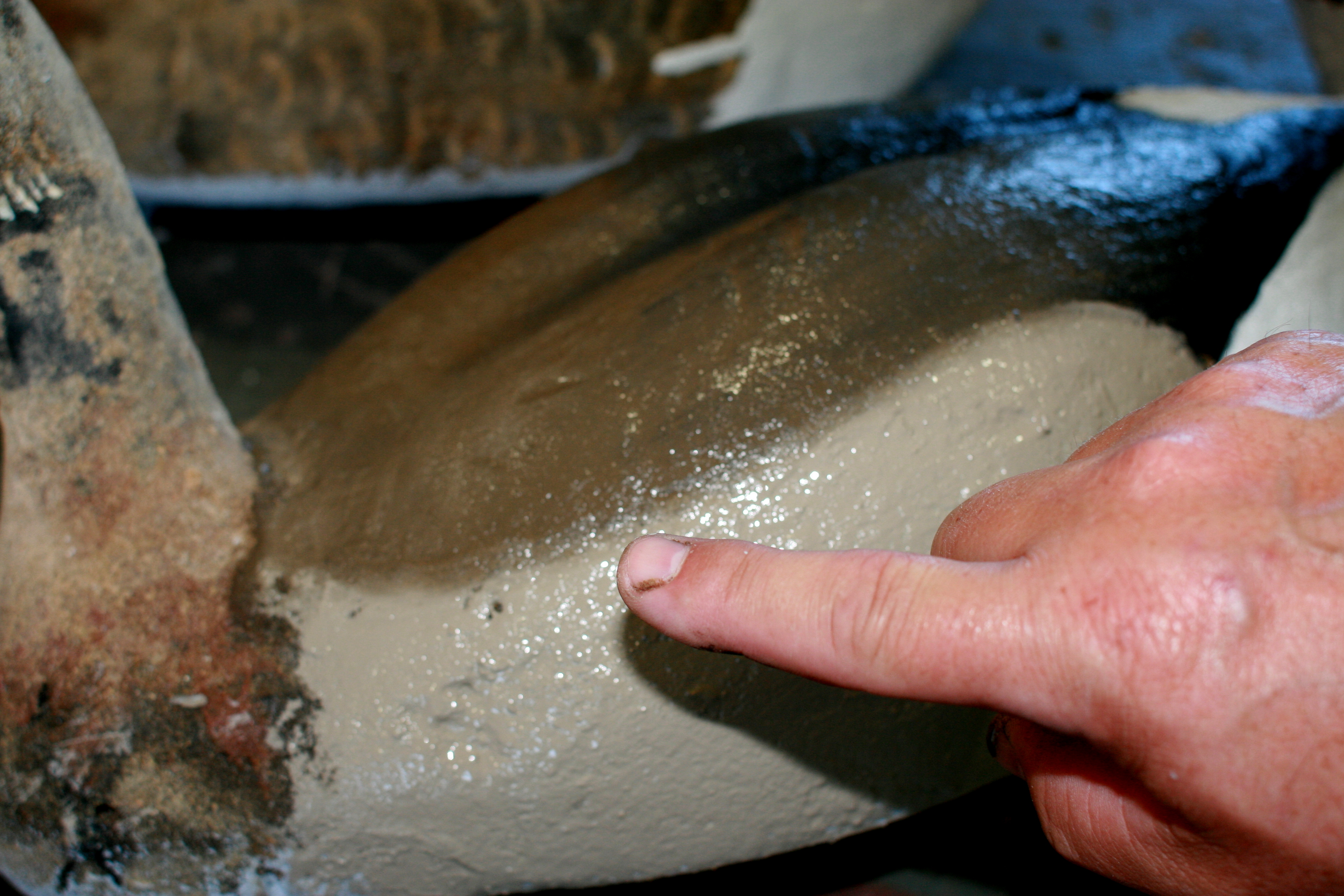 Once the filler cured, I bored holes through it to accept the screw eyes.  I do not countersink the lower end because I want to retain as much structural strength in the neck area as I can.  And because I needed longer screw eyes, I used a couple of new SS screw eyes from Bob’s Rigging.  Each head was refastened into a bed of thickened epoxy – again with the microballoons and the milled fibres.  I carry this mixture up onto the necks and out onto the breasts to spread the reinforcement over a large area – and to distribute the forces the bird will encounter when used.