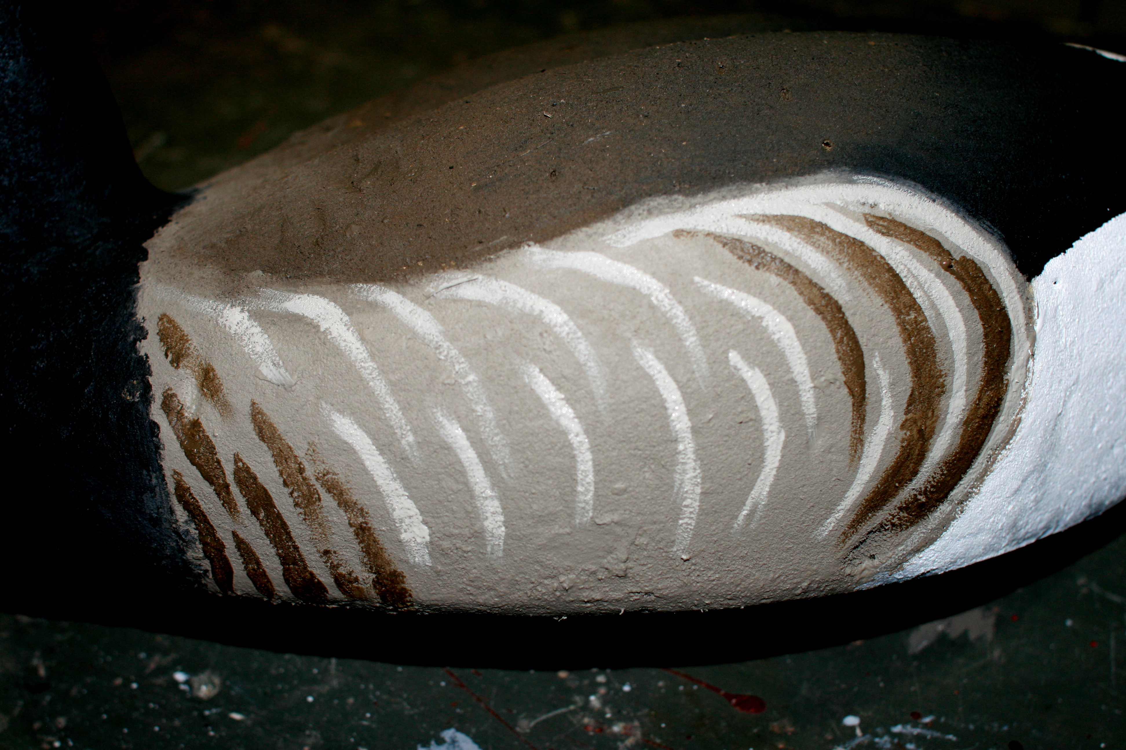 I do  most of my painting with a large (~ 3/4″) square artist’s brush with stiff bristles – these are known as “flats”.  A Brant shows a lot of white on its stern.  Notice how the chalk mark carries the white further forward than the molded-in side feathers.  This is because the body is made for a Canada and not specifically for a Brant.  I use a White latex primer for my whites – mostly because I always have some in the shop.