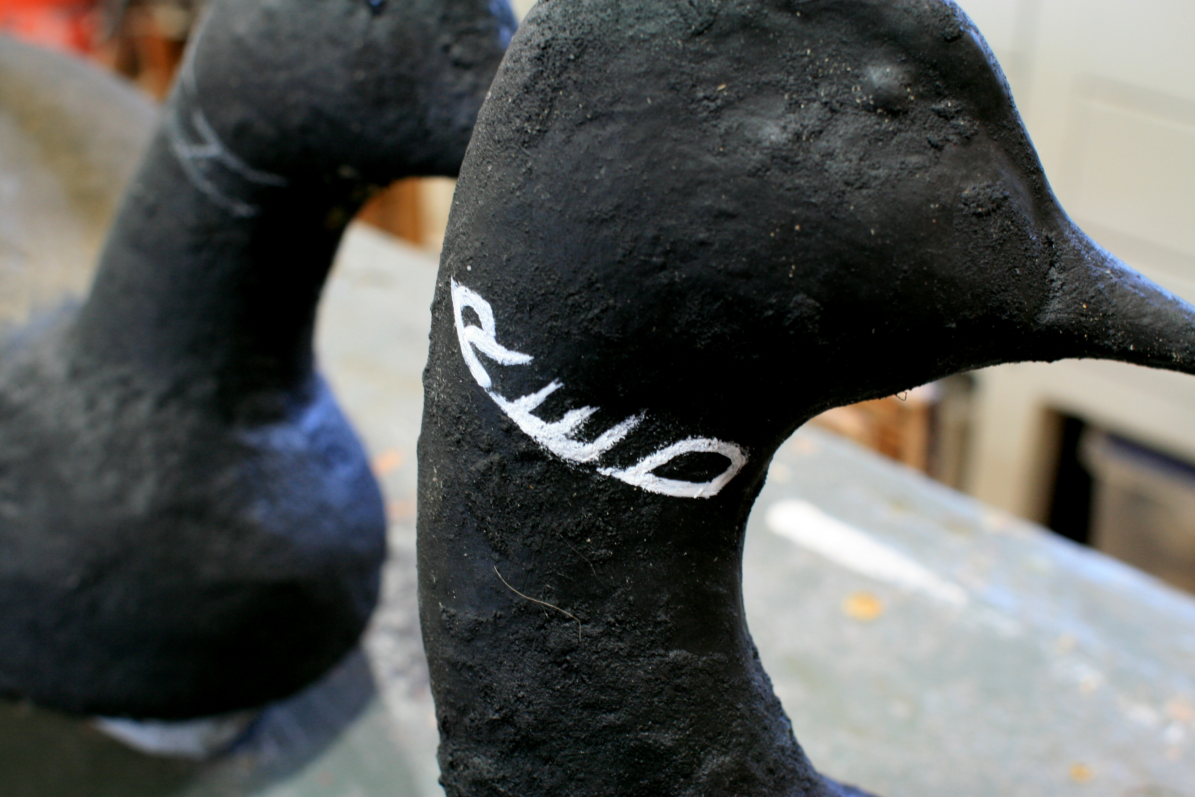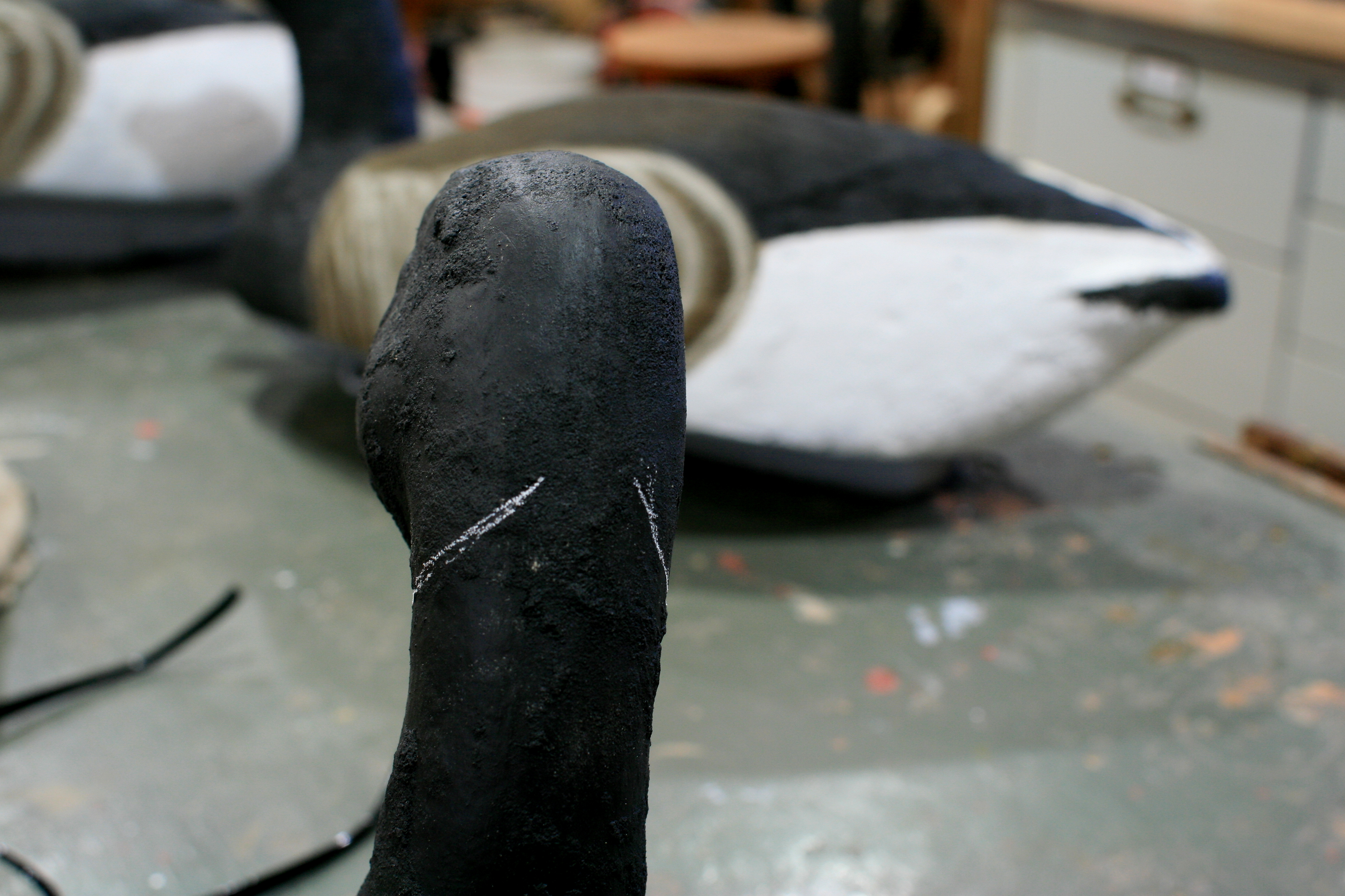 Now I paint the head and breast with Black.  The edges between major color groups can be softened slightly – with a brush or fingers – whatever works.  I let the decoys dry thoroughly at this point.