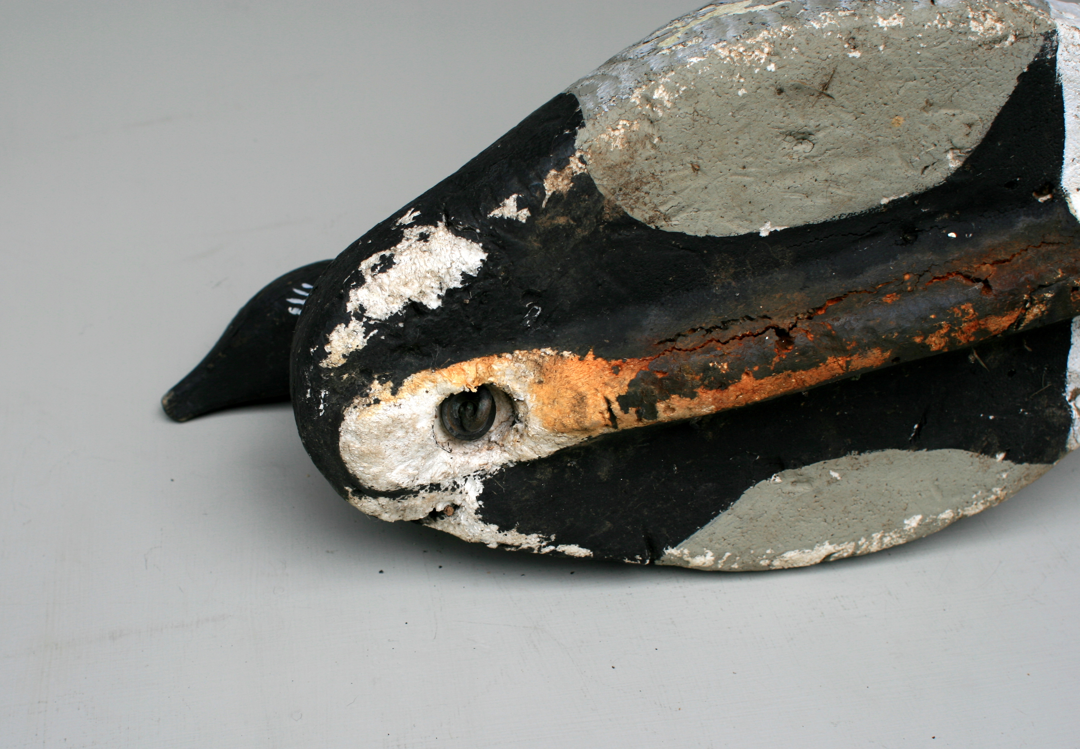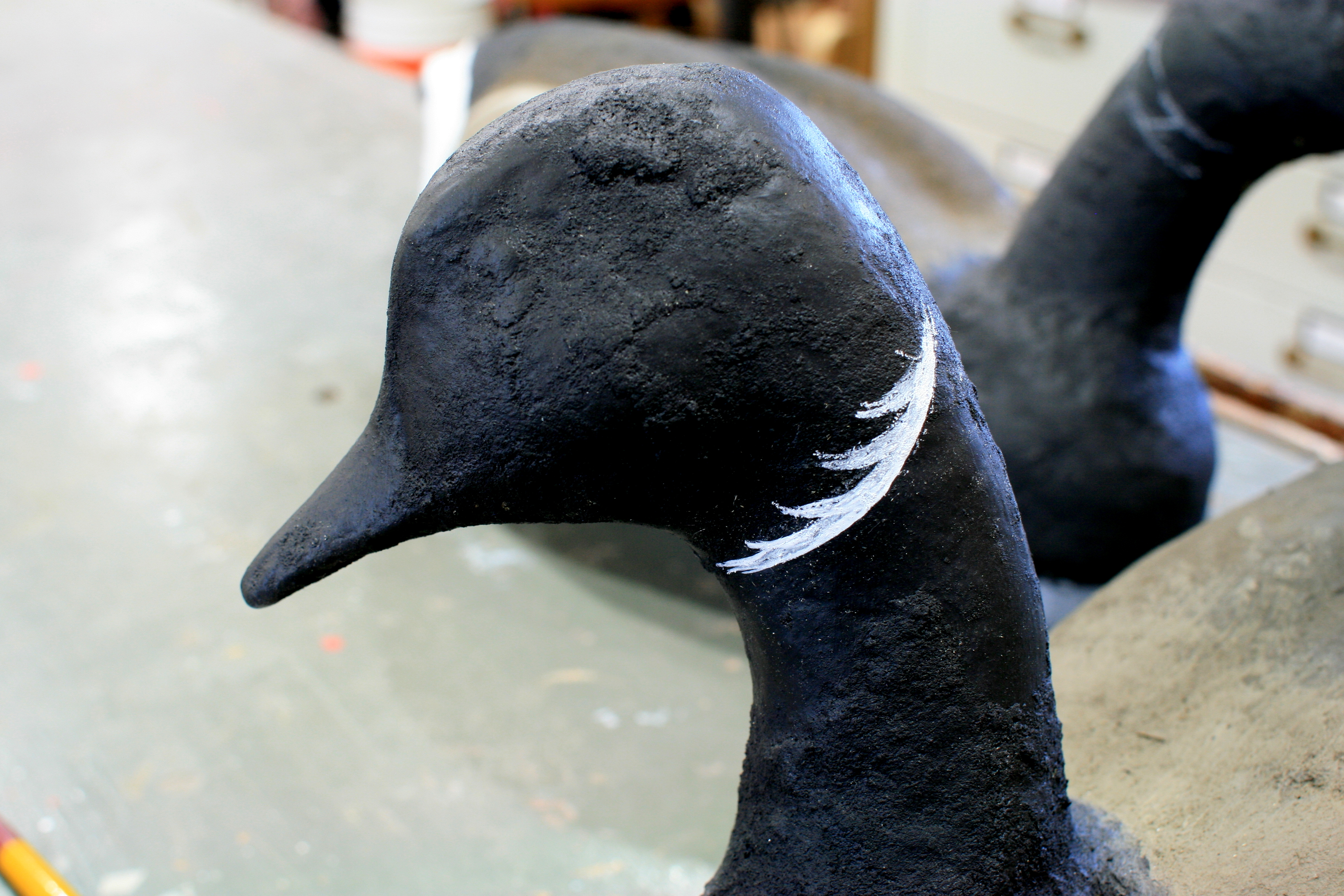 As with every aspect of this grand pastime, there are different schools of thought about how much detail rightly belongs in a gunning decoy.  Clearly, a gunner needs to be built sturdily enough to withstand the rigors of its job.  Many believe that every decoy must self-right – probably a good idea in this species – because it demands a large rig in demanding conditions of wind, tide and sea.  When it comes to paint, many subscribe to a minimalist philosophy.  Herter’s delivered their “Black Brandt” with only Black and White paint having been sprayed upon them.  Brant were painted this way for well over a hundred years and I will happily concede that untold thousands have been shot over the B&W versions.  Dr. Edgar Burke, writing in one of my favorite books – Connett’s Duck Shooting Along the Atlantic Tidewater, provides this advice about painting gunners: “Remember that it is not so much the appearance of the bird in hand but the effect half a gunshot off that counts.”  My own standard is in the same vein,  I think.  Any of my decoys should be painted such that the “effect” fools me when the decoy is half a gunshot off.