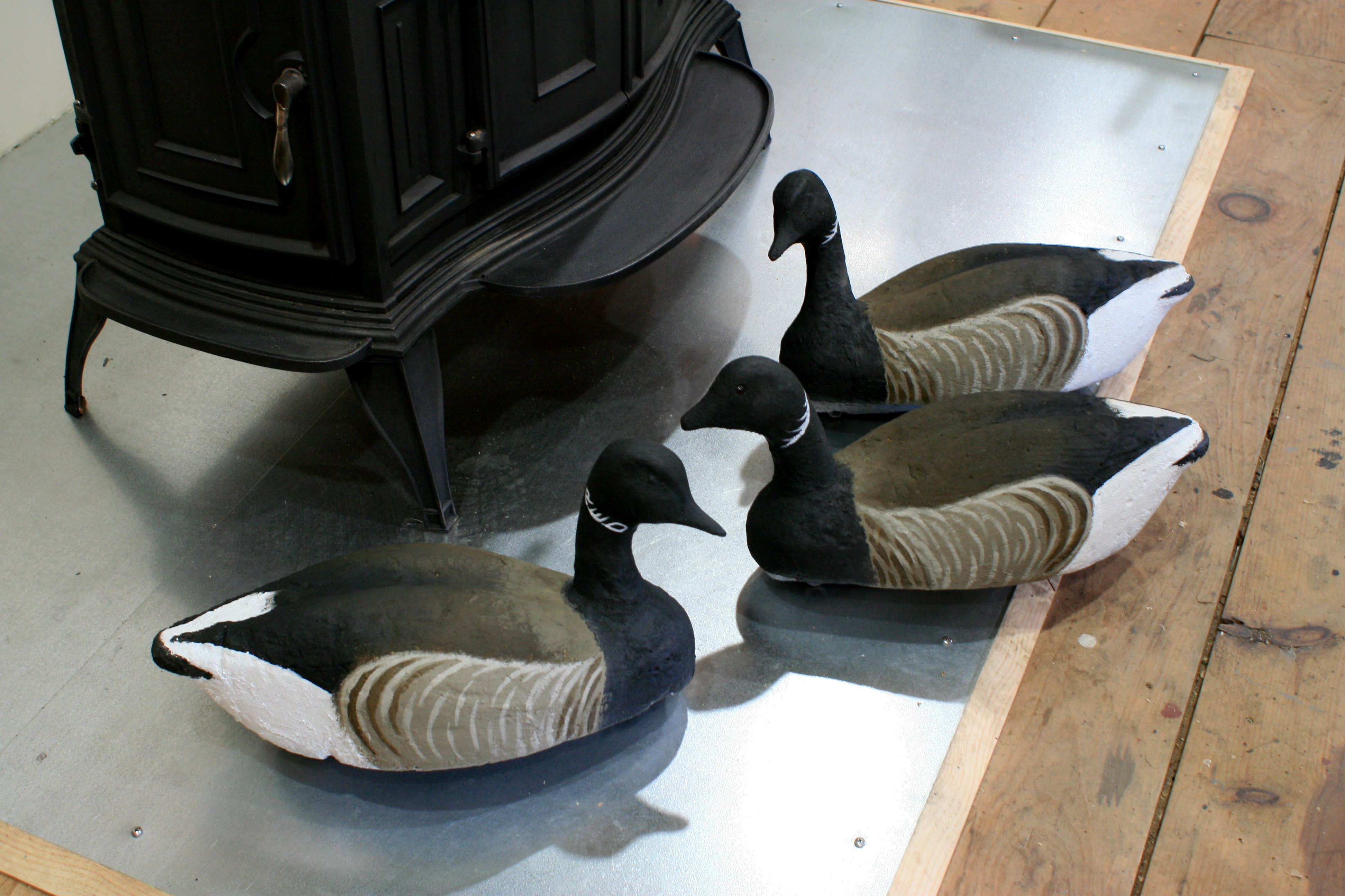 It was bound to happen.  After a wonderful 2-day hunt in January of Ought-thirteen, I offered to refurbish the entire Brant rig for good friends and hosts, Craig Kessler and Fred Wertz.  They shoot over a nice rig of old Herter’s Brant stool – mostly Model 81s and some Model 92s.  Both decoys were originally conceived as Canadas by Herter’s but were easily transformed into a very nice Brant toller with the substitution of a well-modeled Brant head (Does anyone know who carved the masters for Herter’s decoys?).  Although I always think first of the “leaning forward” posture of the feeding Brant, swimming into the current of a falling tide, Herter’s high-head Brant looks “right”.  In the re-print of their 1966 catalog – how many catalogs were ever so much fun to read? – Herter’s offers the smaller one – the Model 81 – in “Black Brandt”.  I think they offered the larger Model 92, too, as a “Brandt” later on.  In any event, they are a very serviceable and effective decoy.