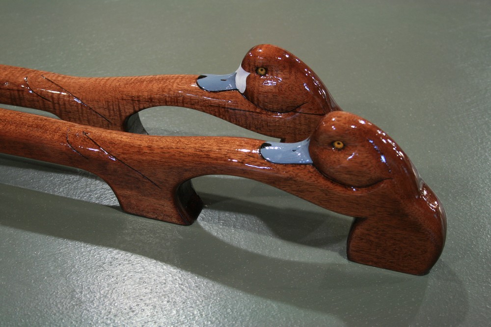 For a long time now, I have looked for ways to put the shape of a duck on my boats. The first I can remember – circa 1980 – was on the tiller of an Old Town Whitecap – the only sailboat that famed canoe company ever made. I had christened her Oldsquaw and so – since she needed a new tiller anyway – I carved the head of an Oldsquaw on the tiller’s forward end. The fat-cheeked contours of the head made a convenient rest for my thumb as I maneuvered her around Great South Bay. Because ‘squaws have a short bill, the straight-out posture caused no problems in the cockpit.