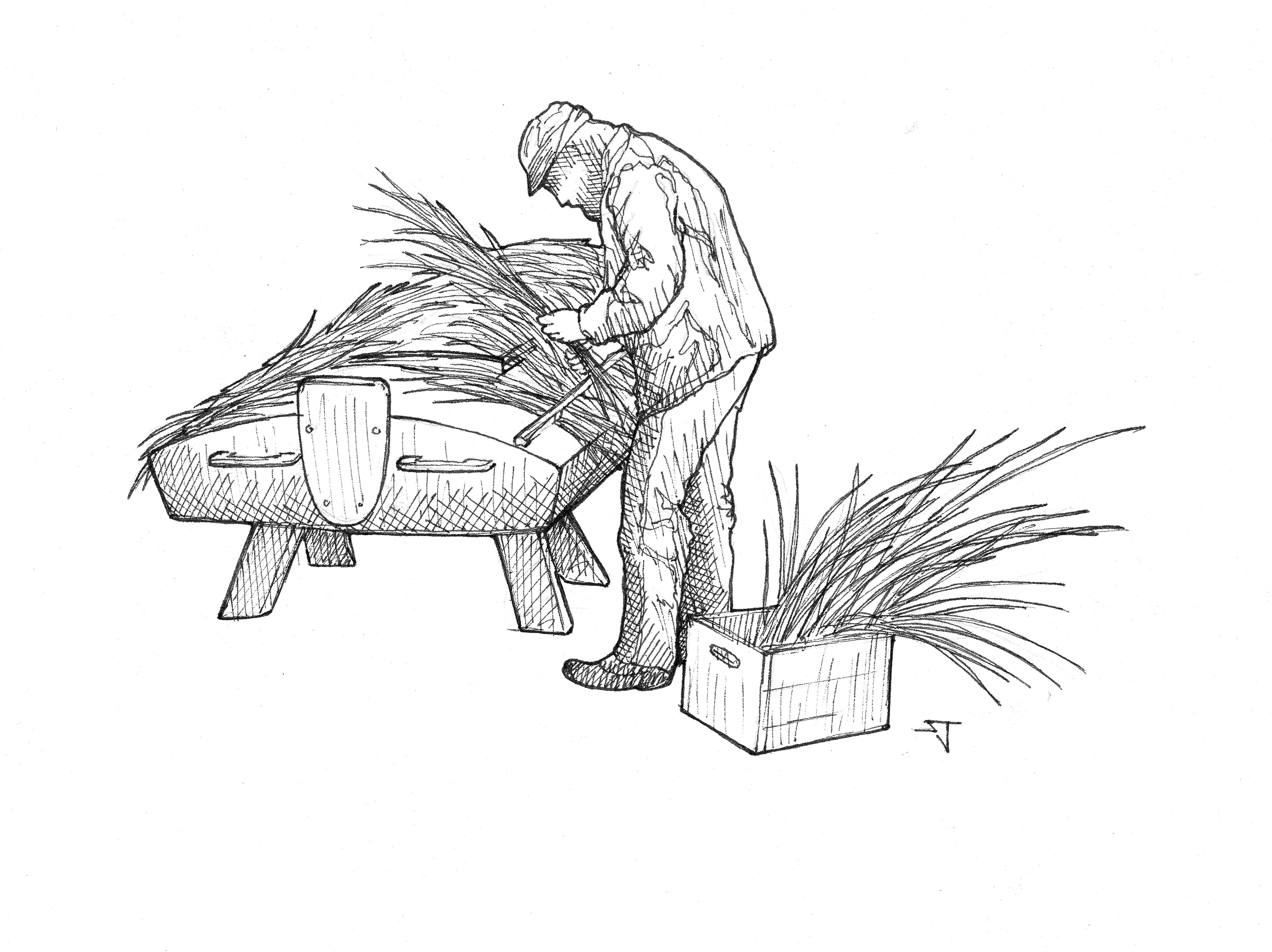 SJS Thatching Grassboat ~ 1981 – lightened Published August 10, 2013 at 5196 × 3889 in One-man Grassboat ← Previous Next → This drawing – of me thatching my first grassboat – has been used by South Shore Waterfowlers for numerous promotional purposes.