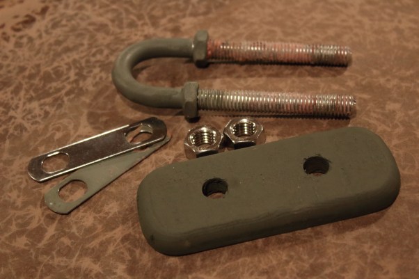 This U-bolt has its own “washer plates” inside and out. But, I added a larger plywood backer for the inside. It is 1/2-inch AC plywood sealed with epoxy. Corners are rounded so it seats evenly against the hull.