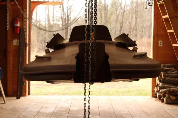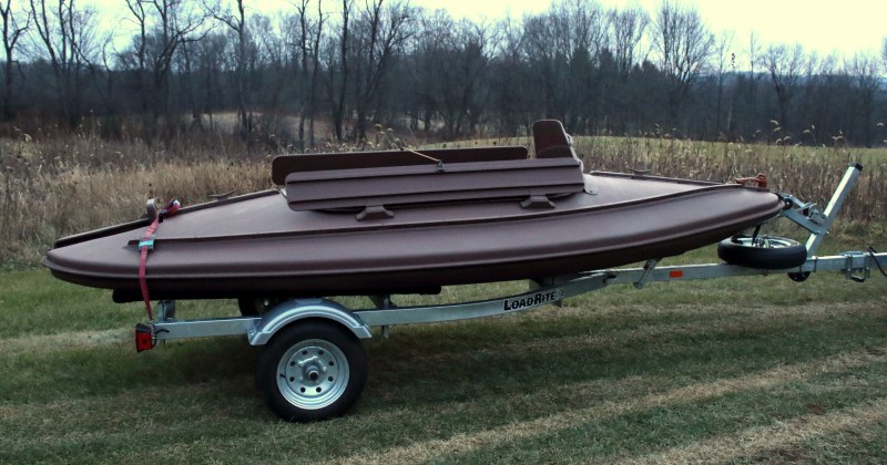 A pair of nylon strap eyes and a “bungee” cord keep the flap boards up when in transit on the trailer. I could watch both the boards and the cockpit hatch as I drove the 230 (mostly highway) miles to Long Island – and nothing moved a bit.