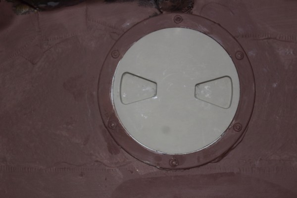 Finally, I cleaned up and re-painted the 6-inch Beckson inspection/deck plate. I scraped out the old and new foam from the threads on the frame and lubricated the deck plate threads with lanolin.
