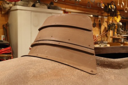 Most South Bays that I have seen use flap boards of one description or another. I am guessing these are factory-original. They were 5-1/2 inches tall and had a single thatch rail. I made new boards that were 8 inches tall and had two thatch rails. The second rail helps to keep the Salt Hay headed they way you want it.