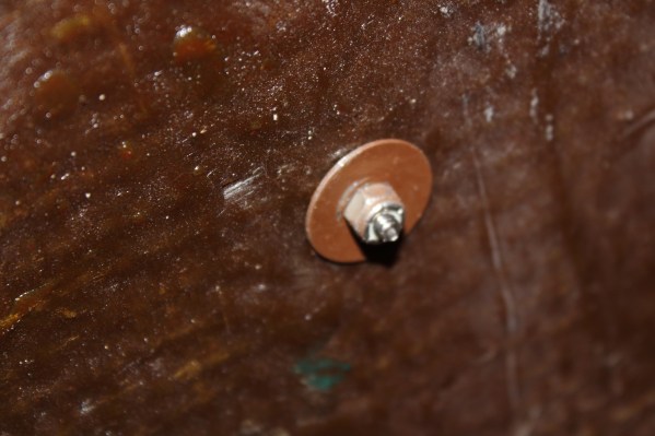 All hardware is brass machine screws. Round heads secure the 2 shields together; flat heads (countersunk) hold the thatch rails onto the shield.