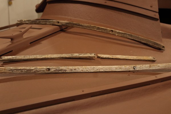 The factory thatch rails were made of White Oak and used nylon spacers. The weather took its toll on the White Oak – and the old rails made for nice kindling in the shop stove.