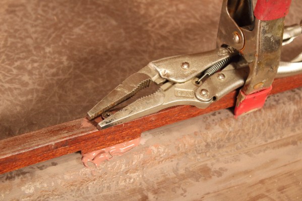 The old thatch rail needed to be made anew – and another was made for the upper extension. Both were clamped onto the jig and glued up with epoxy. The 3/16″-thick spacer blocks were later glued and clamped with “Gorilla Glue” ( a polyurethane ).