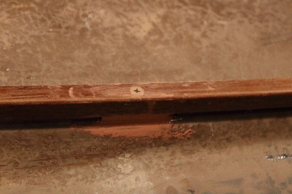 After ripping off all of the wood without tools, I Sawzalled off what was left of the rusted (originally galvanized) carriage bolts and punched them through with a 3-pound sledge. The 5 holes were filled and ground flush inside and out. The other 4 holes are for the new board.