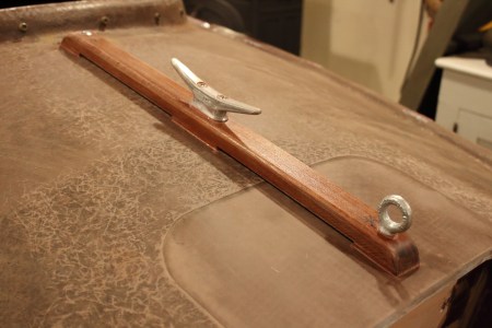 The factory boat had a nice bronze pad eye beneath the bow for towing – either on the water or on a trailer. Although it could take a small snap hook, it was not large enough to take the typical hook on a trailer’s winch. Also, I like to back up such hardware with something fairly substantial.
