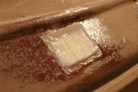 Each patch was thoroughly saturated with epoxy. It was then covered with Peel-Ply – a Dacron cloth that does not stick to epoxy. It allows me to smooth the job before it cures – and so saves lots of sanding later on.