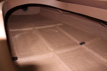 I fastened “curbs” at the forward end – so loose gear beneath the foredeck would not work its way aft when bouncing across the Bay.