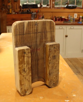 I prefer motor boards with less surface area up against the hull – where they invite trapped moisture. So, mine are held off with spacers. I round (in plan view) and round over the bottom edge to serve as a lifting handle when the motor is elsewhere. I used some old (and thus very dry) treated 2×10 lumber (Southern Yellow Pine treated with CCA) that I’ve kept around in the shop for decades – for such a purpose