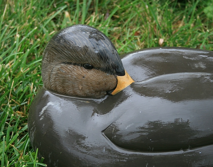 Once I moved north to smaller freshwater hunts, I bought some E Allen birds through Lou Tisch.  I believe the master for these birds was carved by Keith Mueller.  I paint them very simply, spending time only on the faces.  I use 1-ounce sinkers as weights because wind and tide are seldom an issue in the beaver ponds and marshes where i use them – and often have to carry them in.