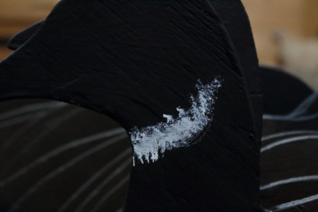The sides could be painted a solid color – I use Behr Ashwood – or even kept just Grey primer. I paint in the curvature of the side feathers to suggest depth.