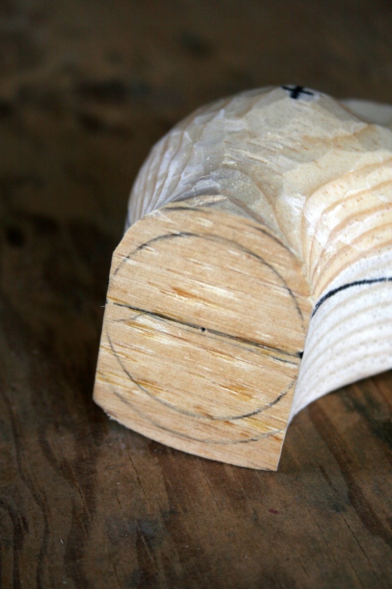 38 – Round neck to outer reference lines on bottom – for now Published August 9, 2013 at 2592 × 3888 in Carving a Mallard Head – Tutorial ← Previous Next → 39. Hollow neck from base up toward widest part of cheeks.