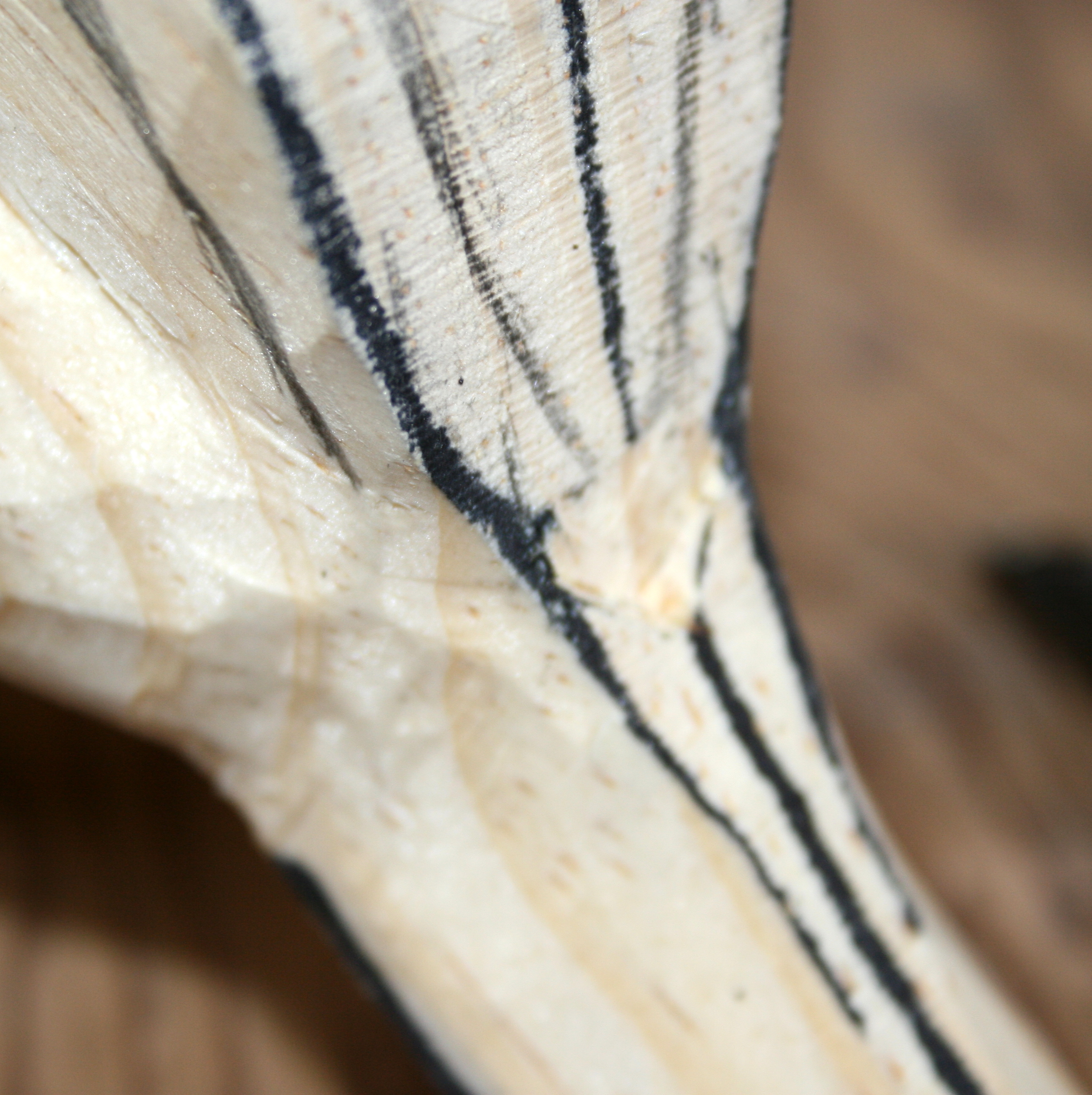 41 – Excavate V notch in bill ramp Published August 9, 2013 at 2586 × 2592 in Carving a Mallard Head – Tutorial ← Previous Next → 42. With tip of knife, carve out the V at the bill processes. This is much easier with a Foredom or the like.