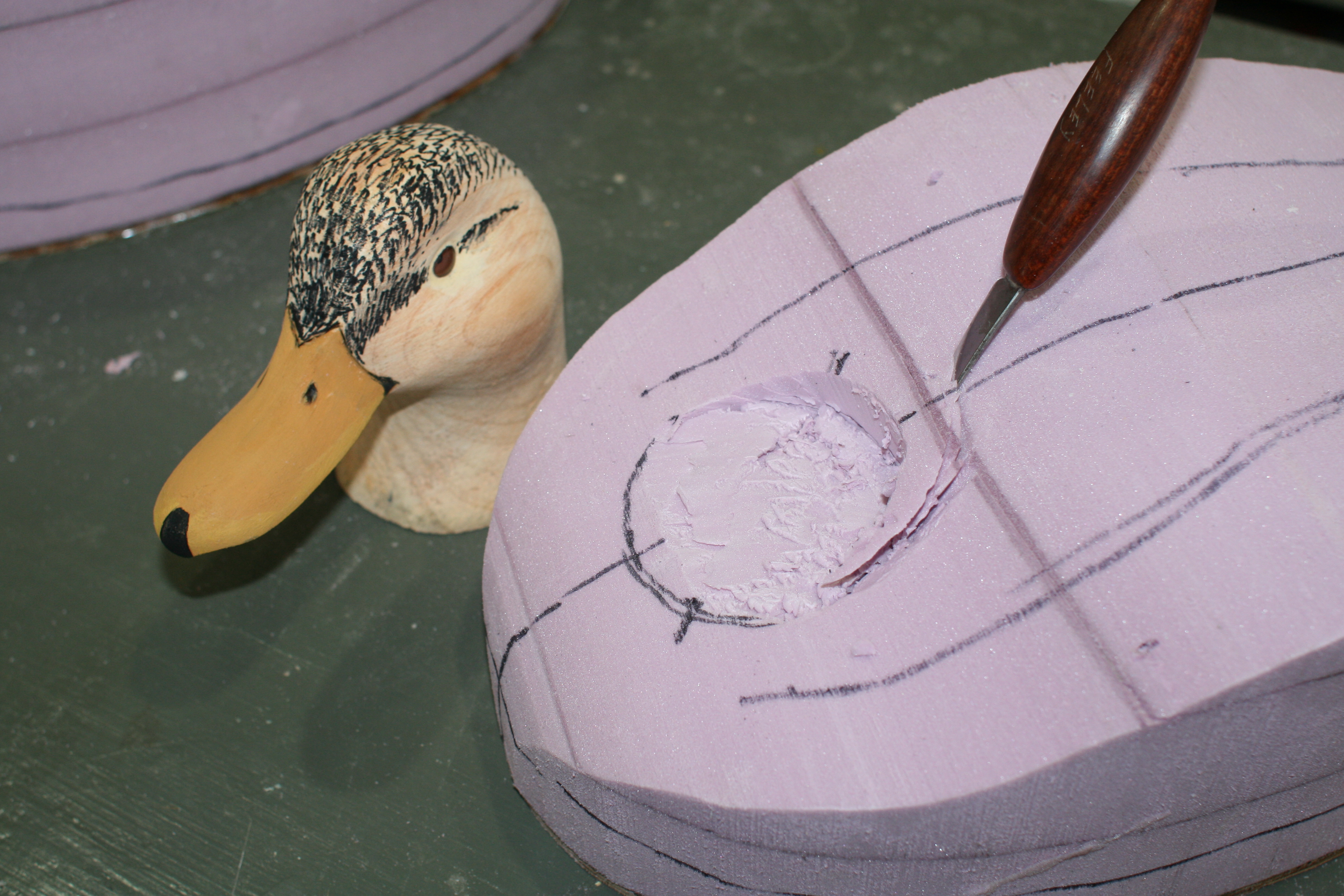 22 – set head on body Published August 12, 2013 at 3888 × 2592 in Foamer Decoy Tutorial – a Black and a Mallard ← Previous Next → 23. Carve out neck base to seat head.
