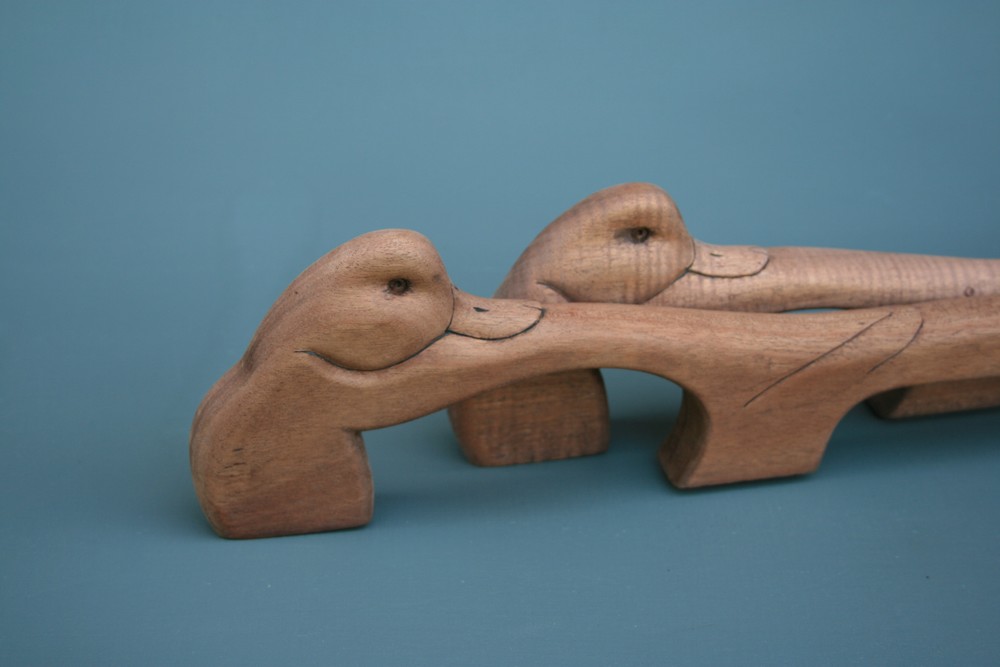 The eyes and bills and the Hen’s white “mustache” were painted with acrylics after the first coat of varnish was sanded.