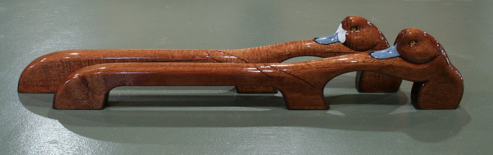 But, I believe it was a bow handle for White-Wing – a 2-man “scooter” I built in 2013 – that spurred this latest project. I know Long Island duck guide Red Oster saw White-Wing last winter. He called a couple of months after the season and asked if I would make him a pair of grabrails for his “mother ship” – the 34-foot Lofstedt-built Commanding Mistress. He has a pair of perfectly functional grabrails on either side of the companionway. He wanted something with a bit of charm, I believe. And, like so many of us who grew up on Great South Bay, the species could only be Greater Scaup – better known as Broadbill.
