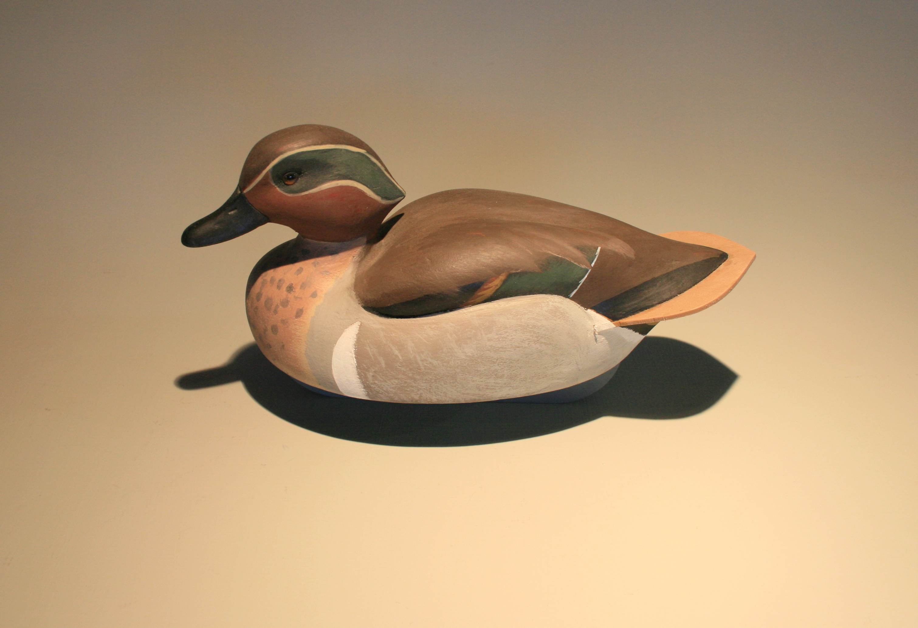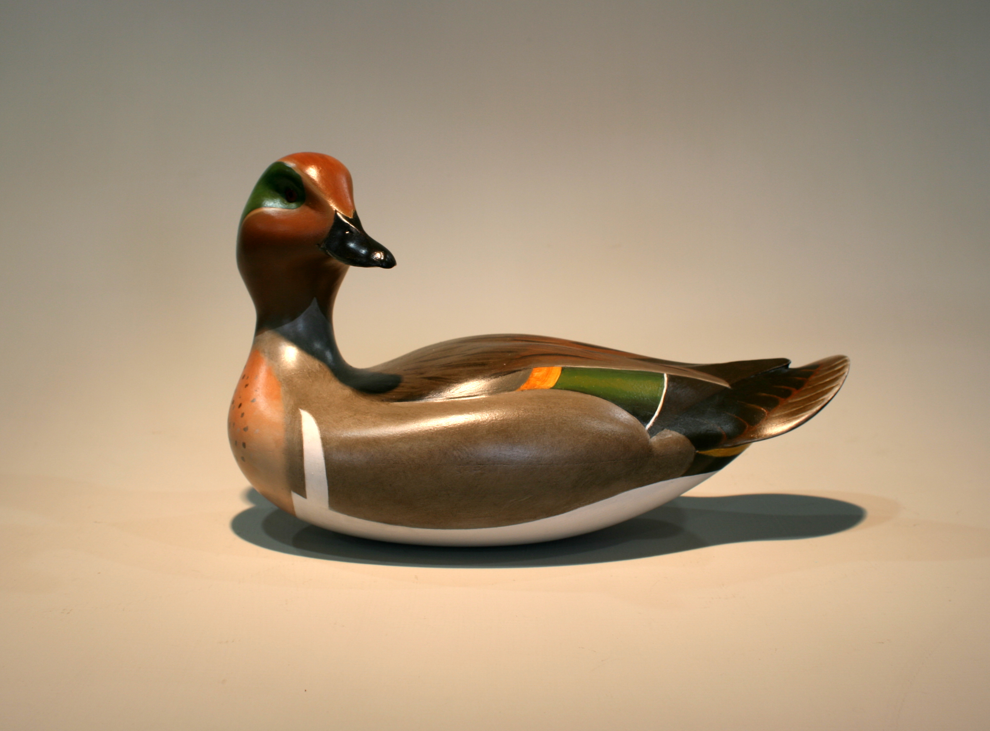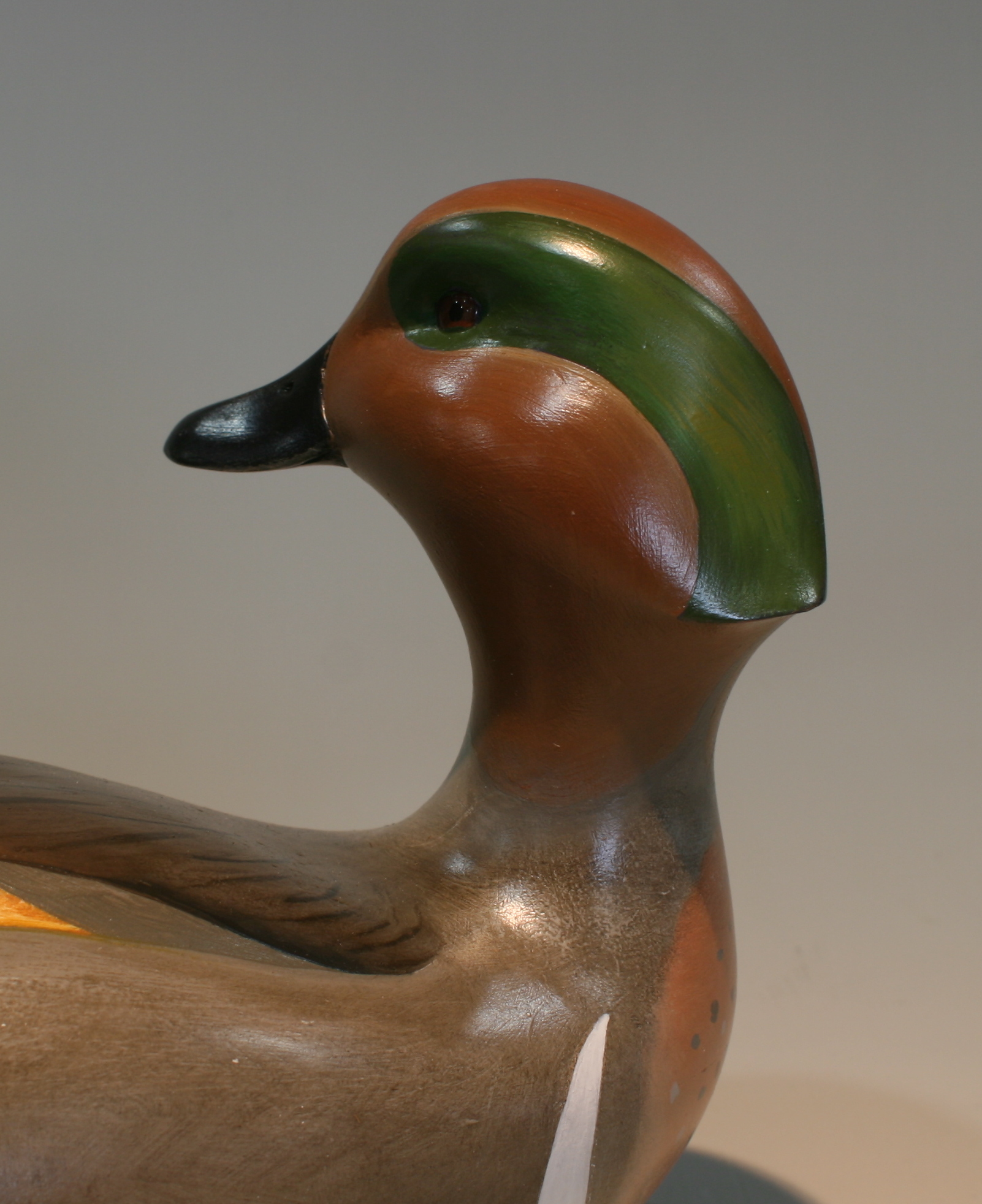 I hope this posture combines this little Drake’s grace with some tension.  He is thinking about preening but needs to make sure everything is well with the world first.  And, although I did not drop the wing, I did exaggerate the speculums so their patches of iridescence would balance those on the headdress.  Finally, as with all of my wooden birds, he is hollowed with fairly thin walls – so he tips the scale at about 7 ounces.