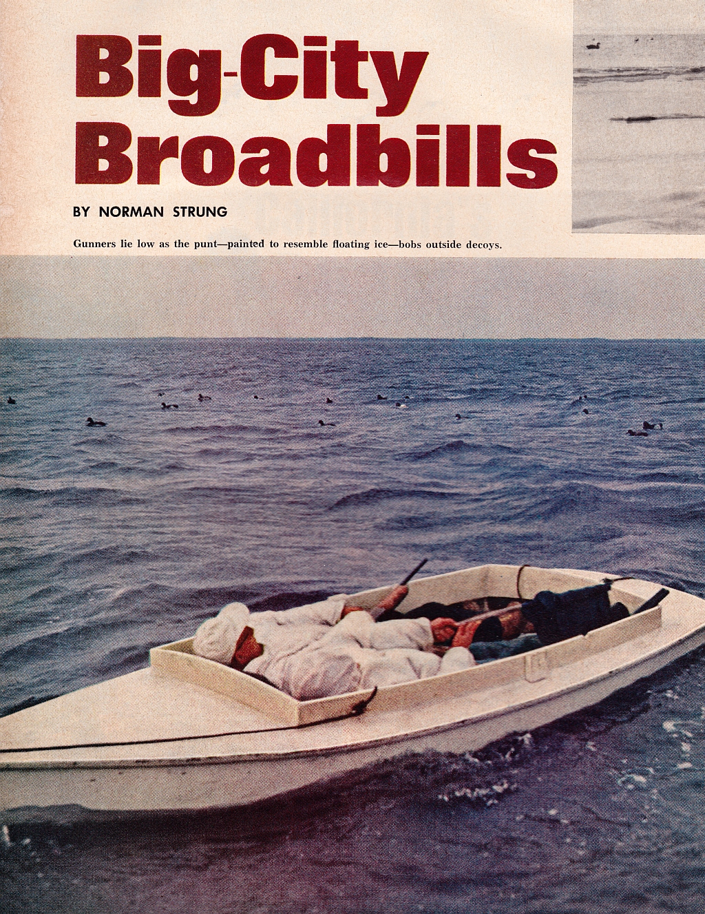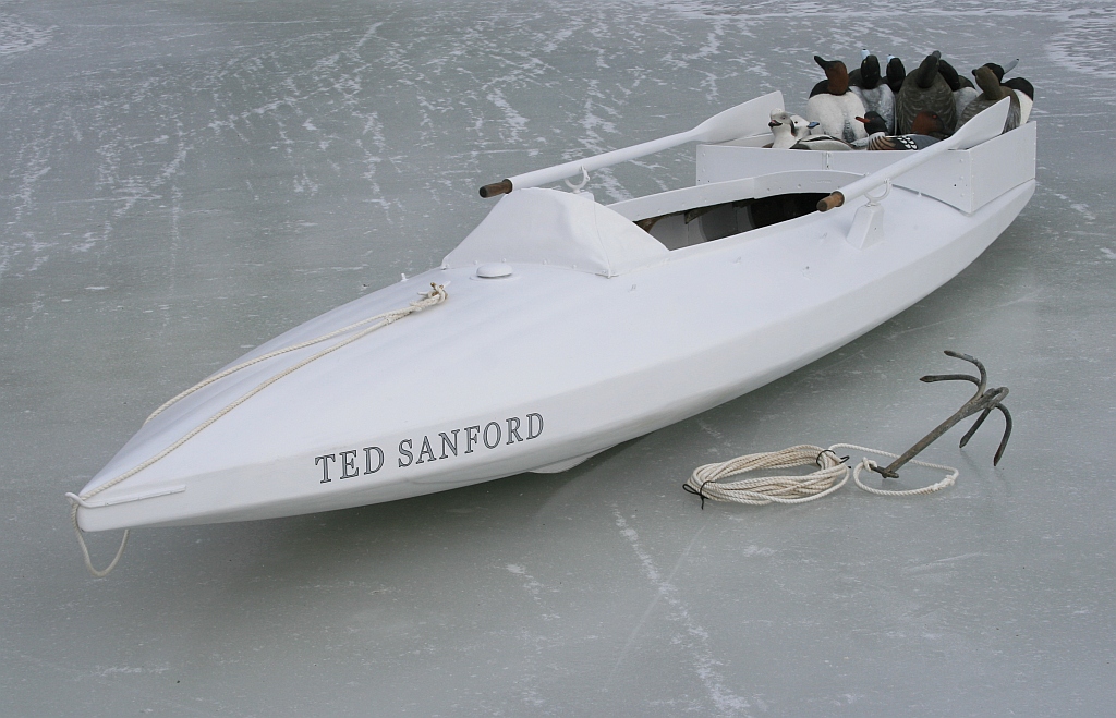 We used the term Scooter loosely. The original Scooter was developed at the east end of Great South Bay – on Bellport Bay in the mid-1800s by Captain Wilburn A. Corwin. Shod with a pair of metal runners – first iron then later brass – the Scooter was designed to cross saltwater ice by dragging, piking or sailing – and also to cross open water with a pole, a pair of oars, or a small sailing rig. These boats – almost always made for a single occupant – proliferated throughout Great South Bay to the west and were embraced by baymen and gunners alike. At that time, Great South Bay was also home to – and perhaps the birthplace of – the battery. Market gunners used them until the sale of waterfowl was outlawed in 1918. Although the battery was always controversial – because of its effectiveness and because it also “robbed” shorebound gunners of the birds – their use remained legal on Great South Bay after the Migratory Bird Treaty Act. Many of the same baymen continued to use the same batteries for guiding parties of sports – for the unsurpassed excitement of having flocks of Broadbill – and Redhead, Canvasback , Brant and others – approach at eye-level and sea-level at the same time. Use of the battery itself, though, was finally banned in 1935. This spurred the use of Scooters to take the place of the battery. And, as with any technology, the boats became specialized for their new role. Instead of crossing ice-bound bays, the Scooter was now pressed into service as the open-water blind for gunners. As with batteries, gunners strove for a low profile and lay on their backs while waiting – and then sitting up to shoot. Some Scooters were built wider and flatter and were known as Pumpkinseed Scooters and others were built taller but with low gunwales and were known as Whaleback Scooters. Some retained their traditional white paint – to approximate the ice – and others used a shade of grey – to approximate open bay waters. Later, other types were developed – driven especially by the advent of marine plywood and later by fibreglass. Although the naming of boat types adheres only loosely to any “rules”, most boat historians and builders would probably designate the Horal Scooter as a skiff – because of its flat bottom, pointed bow and transom stern. Most skiffs are not decked over – but Long Island duckboats are always enclosed except for their man-sized cockpits. Author Strung refers to the Horal Scooter as a punt in his Sports Afield story – but, in my opinion, that stems from the Bellport Bay term for their simpler duckboats; those with pointed bows, transom sterns and cross-planked bottoms were known as “punties” – as distinct from the Scooters which had round-bottoms and sometimes fantail sterns. True punts are square at both ends.