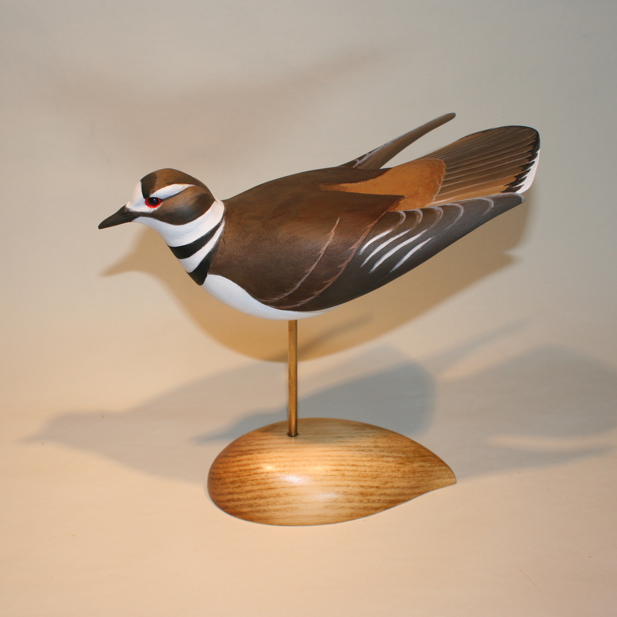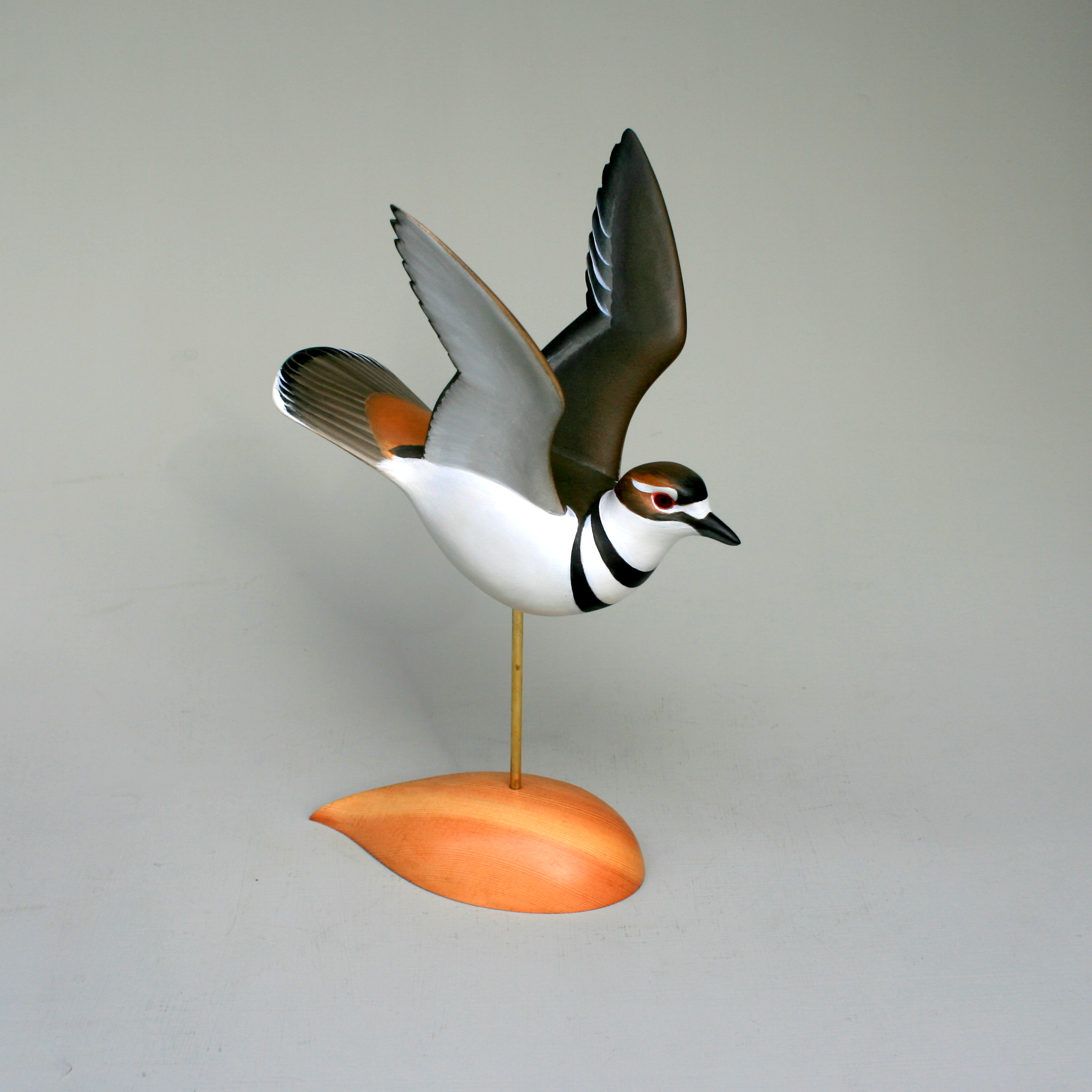 The noisy Killdeer is one of the species I rely on to tell me spring is just about here. And if its call alone is not enough to get you to notice, it will probably catch your eye with its flashy antics. The Killdeer is famed for its “broken wing display” – a fake behavior that very effectively draws your attention away from a nest or young. It always seems to be flying too close, spreading or raising its wings, scampering along a patch of bare ground. I tried to capture a bit of this “reckless” behavior in this carving – within the limits of the grain of the White Pine. It is carved from a single piece and so I could not turn or arch its head anymore than I have – I try always to keep the structural integrity of any carving and did not want to involve any sure-to-break cross grain. The brass post is close enough in hue to its real legs and the free-form, oiled base reflects, I hope, the barren grounds over which they run.