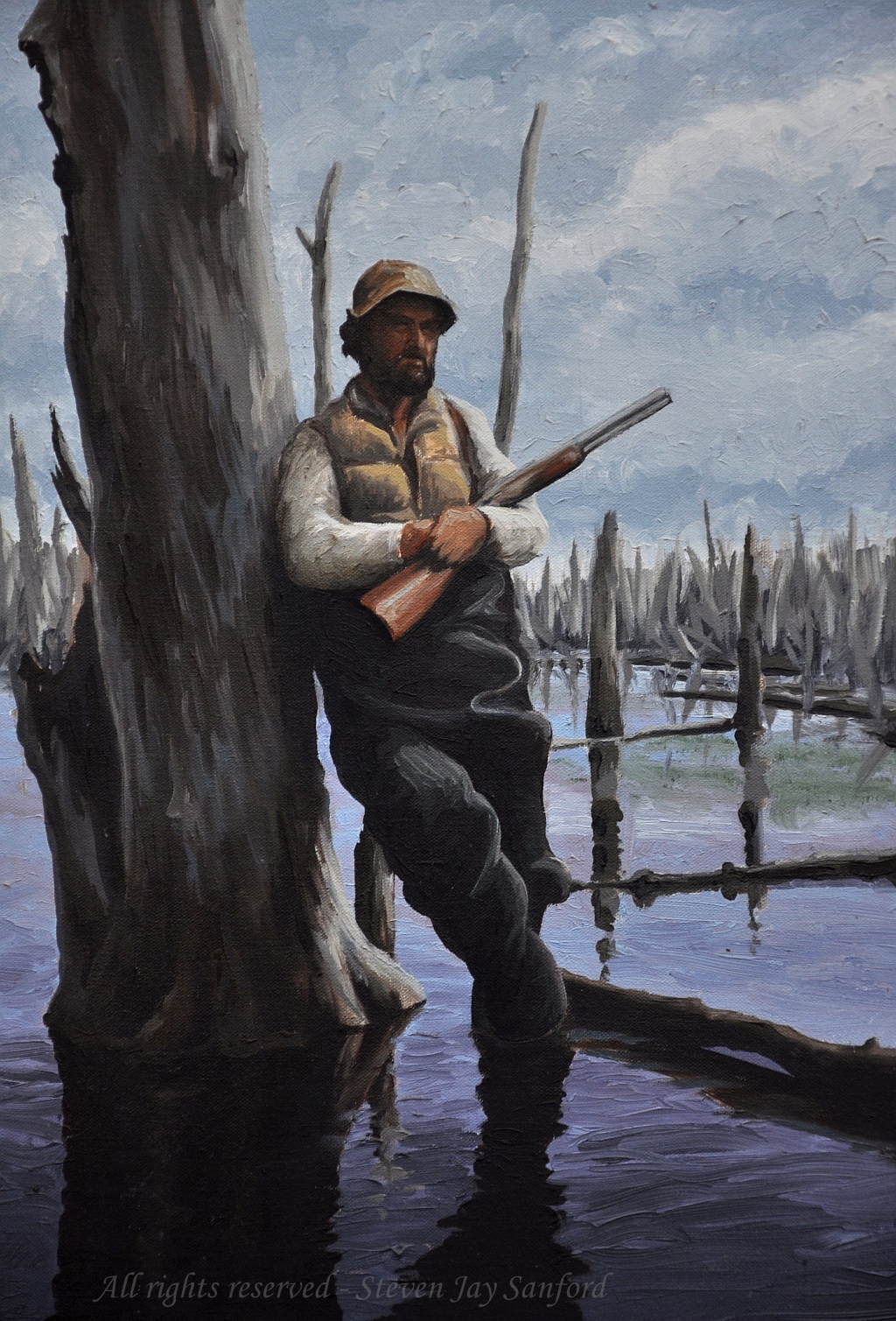 This is another oil that I did while learning through Suffolk – I call it The White Shirt. The subject is good friend and colleague Mike Scheibel. For many years we traveled from Long Island across New York State to St. Lawrence County to hunt at Upper & Lower Lakes WMA in early October – about 6 weeks before our season opened on Long Island. The flooded impoundments ultimately killed most of the timber. But, when we were hunting, hiding was easy – even if you were wearing a white shirt.