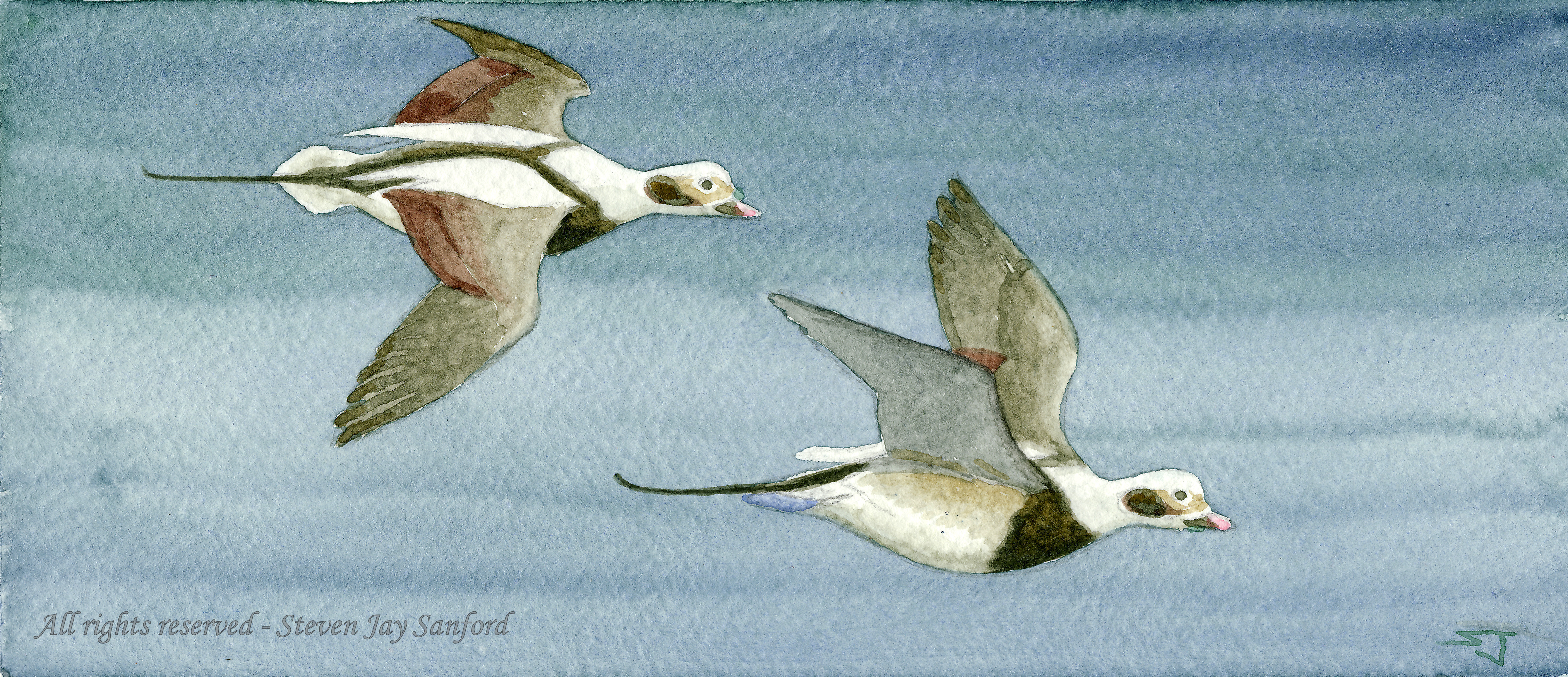 I enjoy contrasting the “diagrammatic” cheek patches and the two-tone bill with the soft face and its several transitions in tone and hue. Likewise, the chestnut speculum and the individual tail feathers are intended as surprises, discovered only upon close inspection.