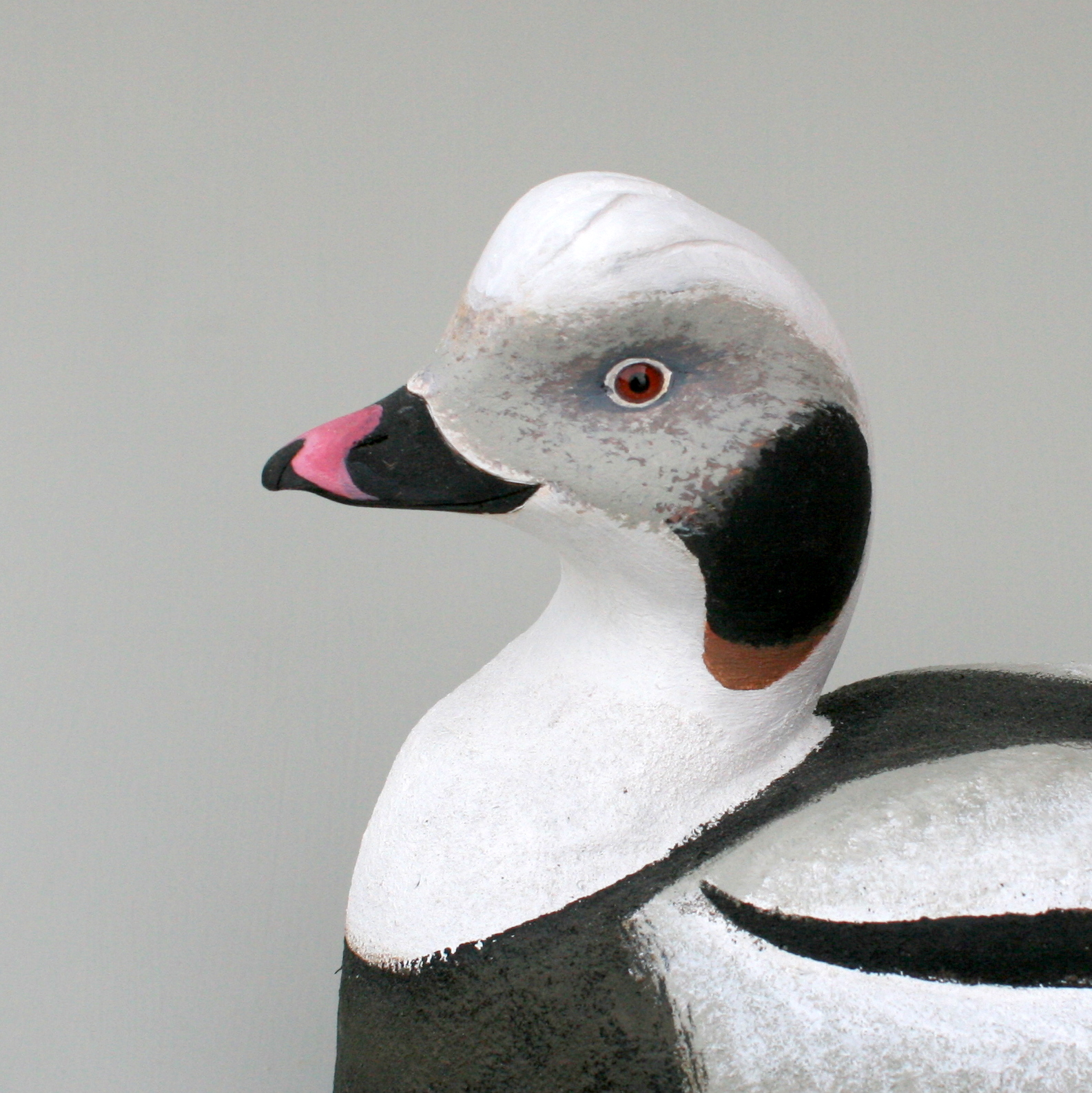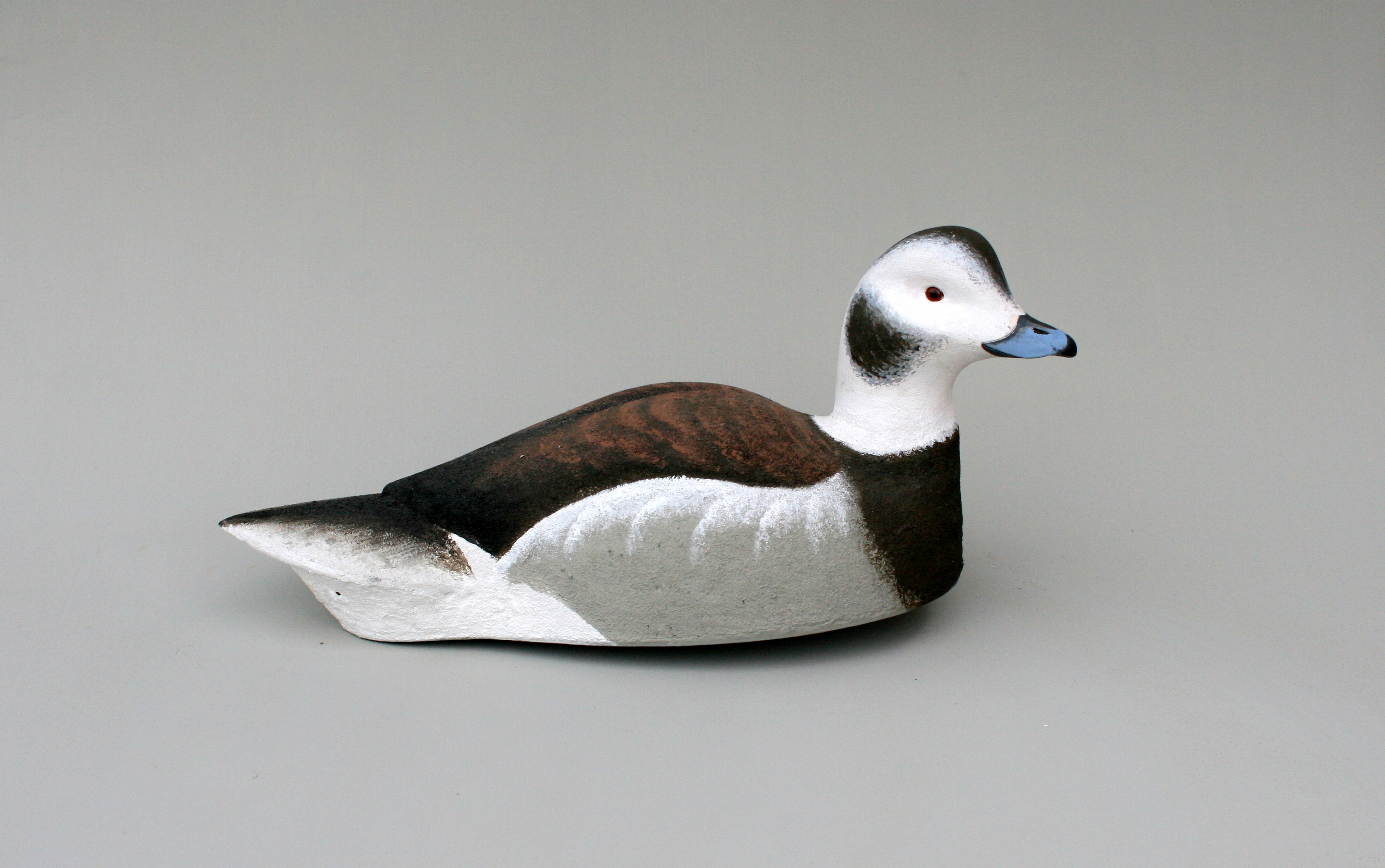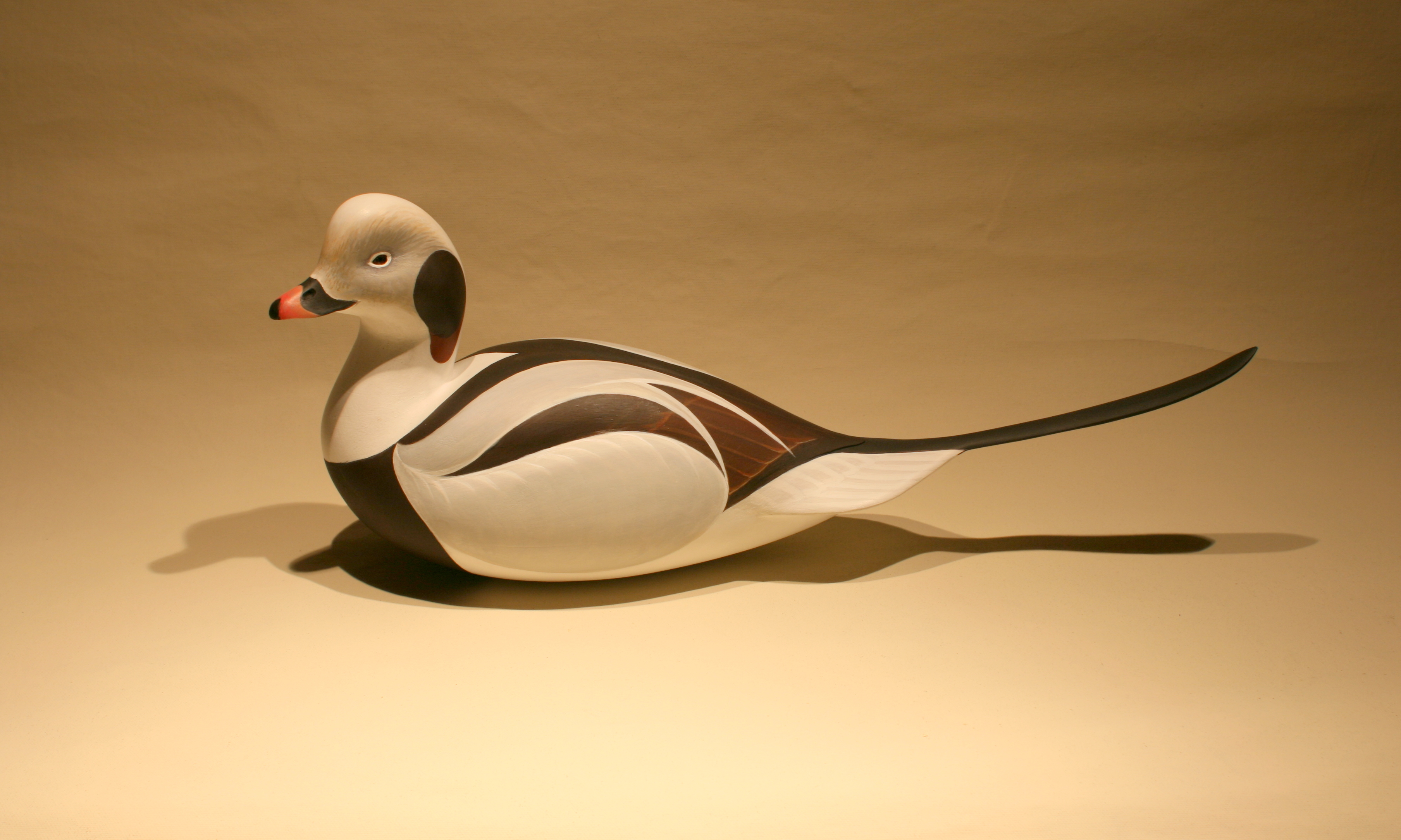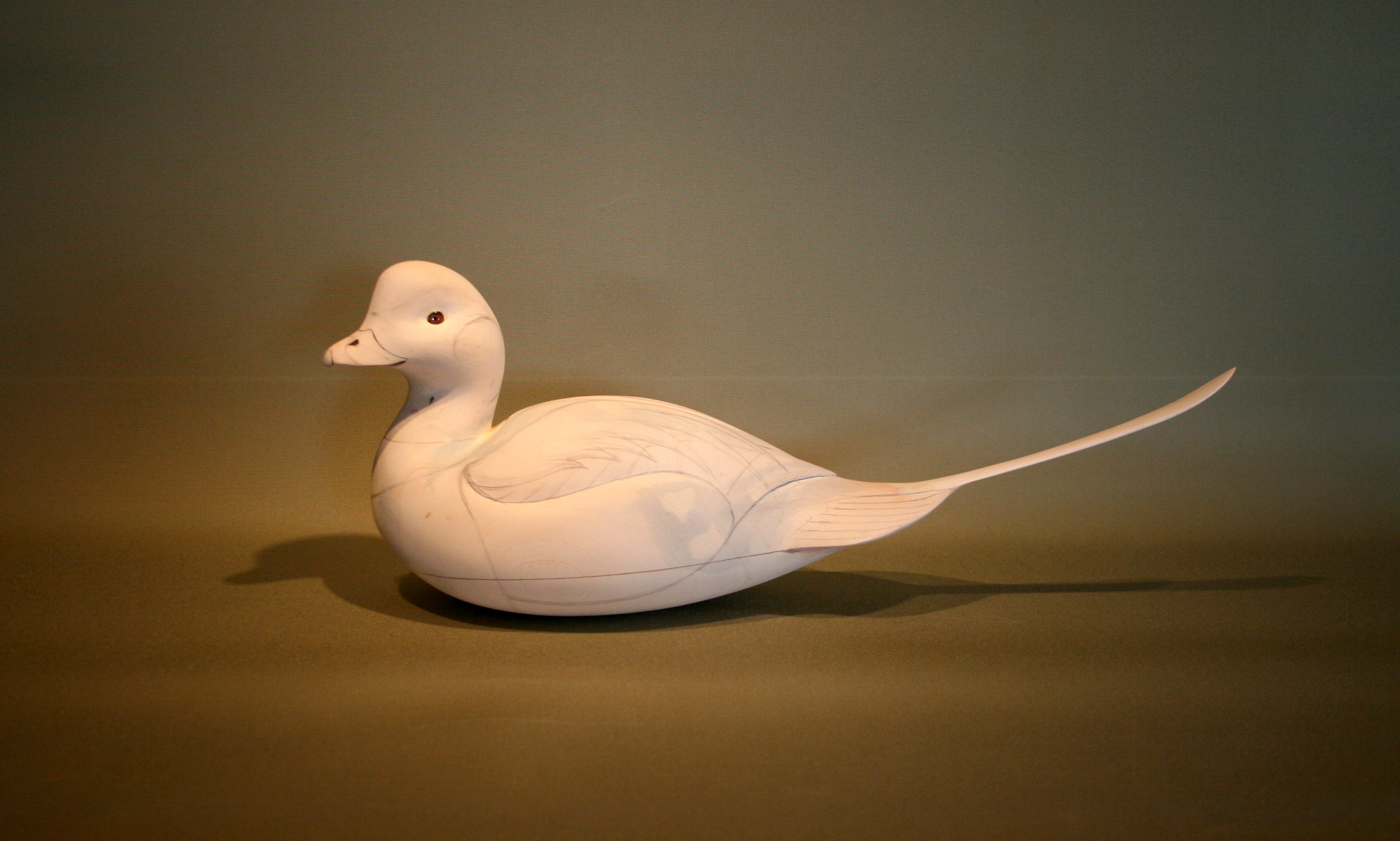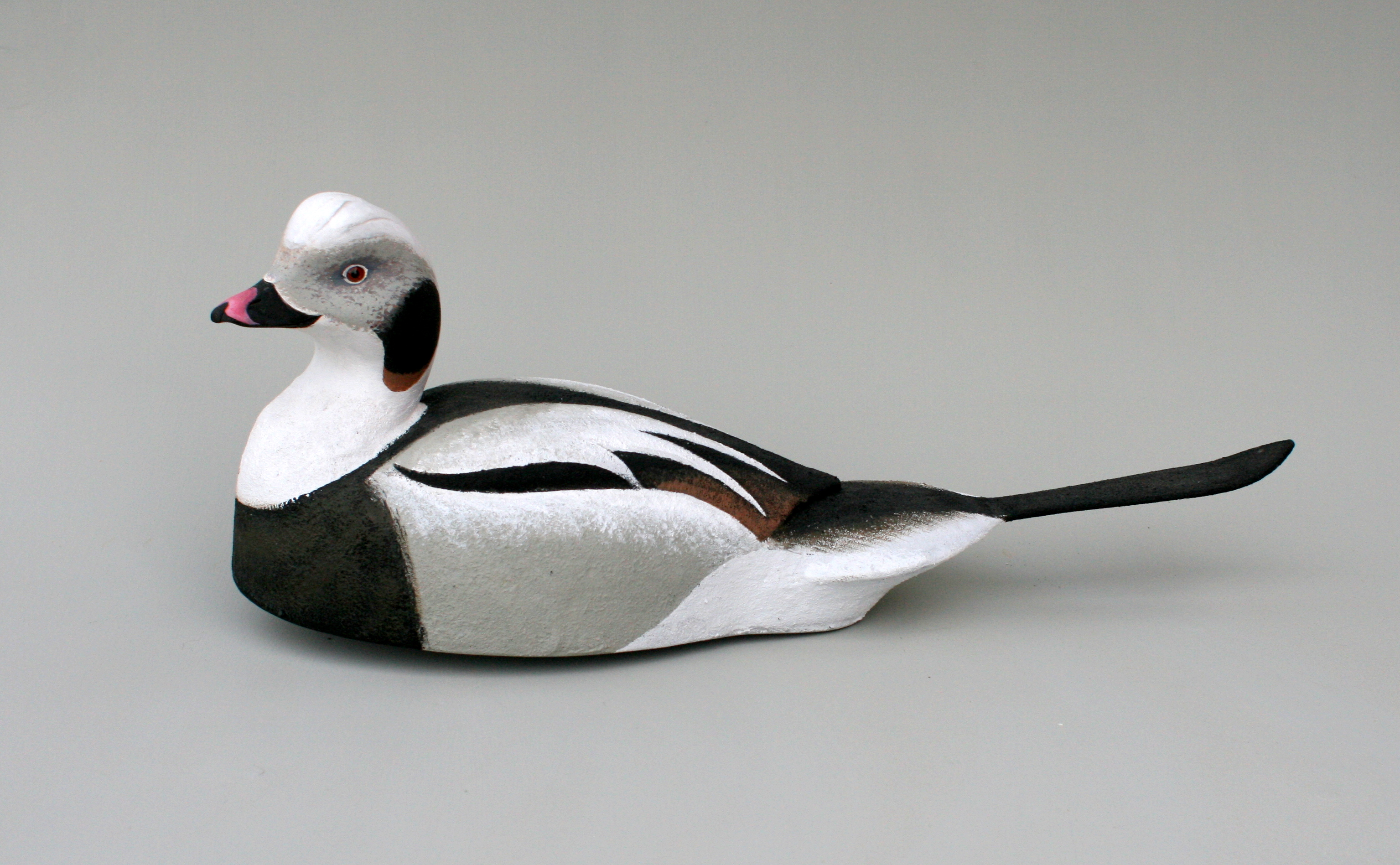 The Oldsquaw allows me to express my decoy carving philosophy and style more than most species. It allows me to incorporate all of the most important design elements in a single floating sculpture. Most of all, this bird is about curves – they are everywhere on the bird and allow me to emphasize and even exaggerate them so that they can all work in harmony. Although I have carved a few gunning Oldsquaw decoys, my “mantelpiece” Oldsquaw requires – in my mind at least – the round bottom to complete the sleek and voluptuous form.