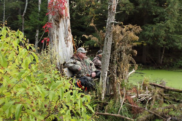 Because the flight pattern is highly predictable, safe spectating is a natural. About a hundred feet behind the blind a big Hemlock decided long ago to lay down across the Swamp. So, three spectators – the proverbial Bumps on a Log – could observe the goings on as well as from any “luxury box”.