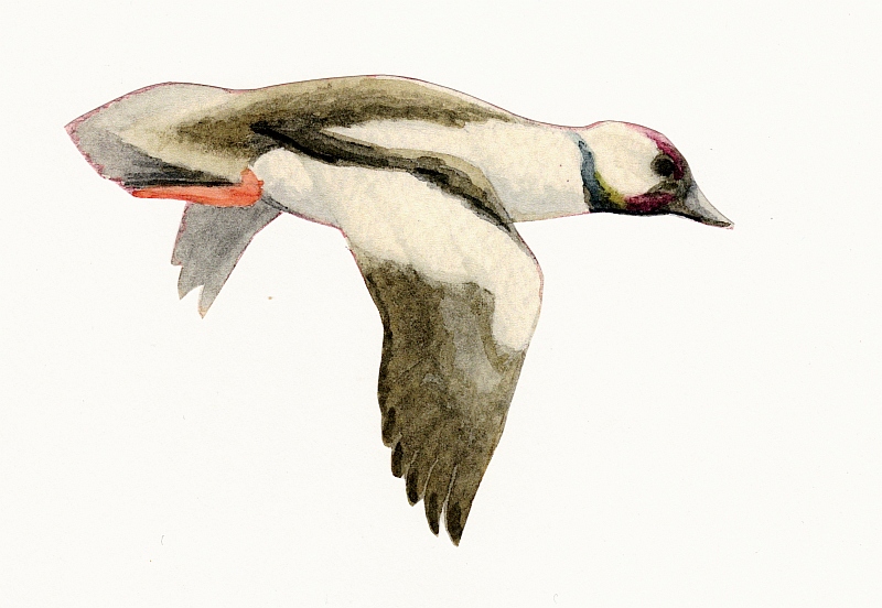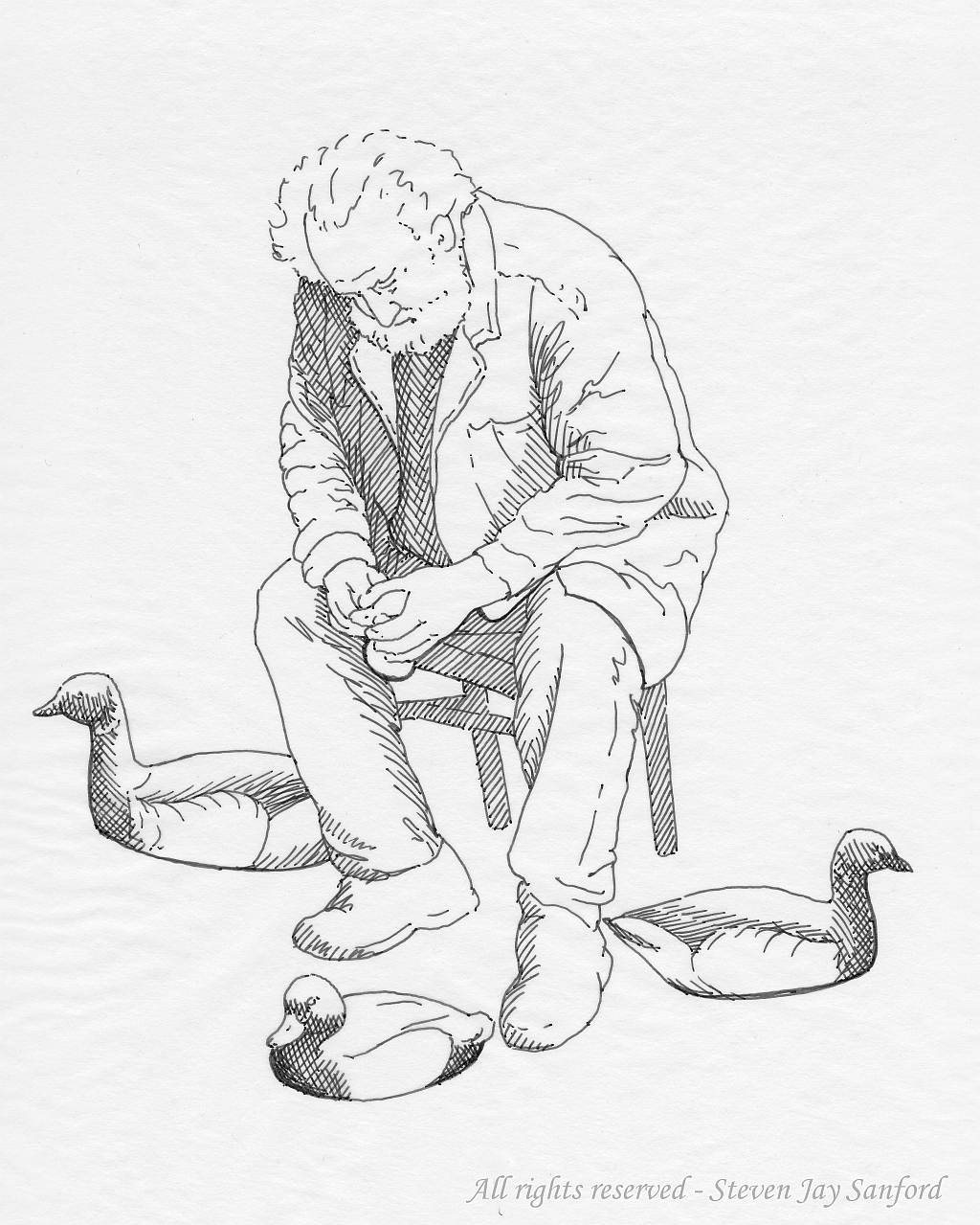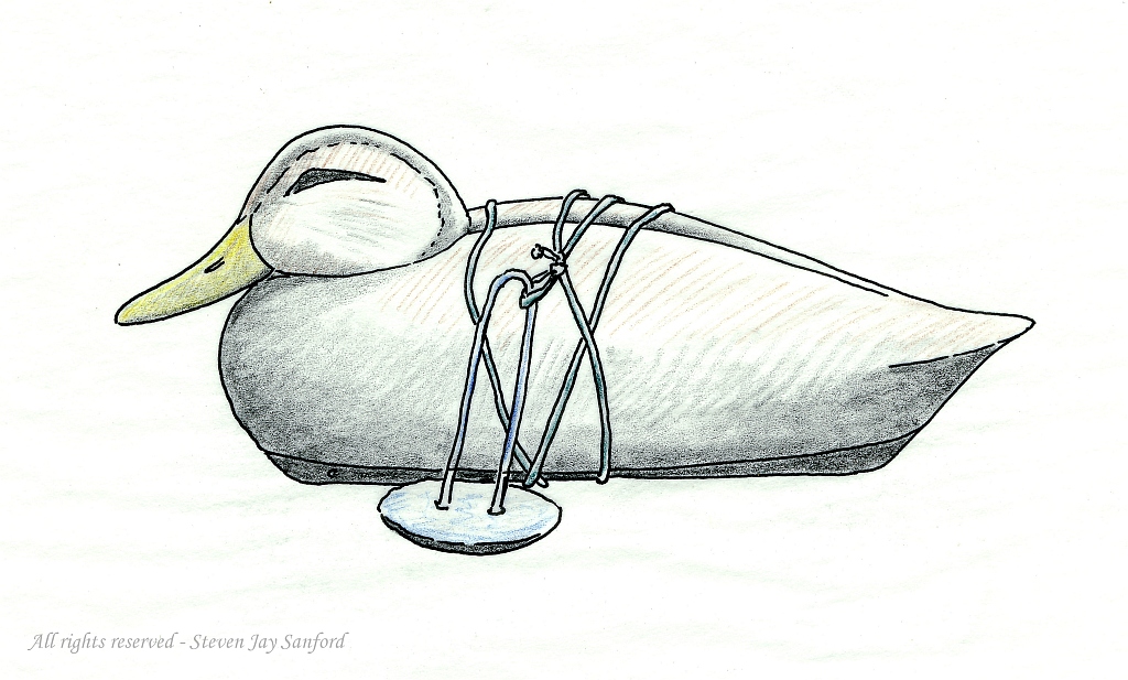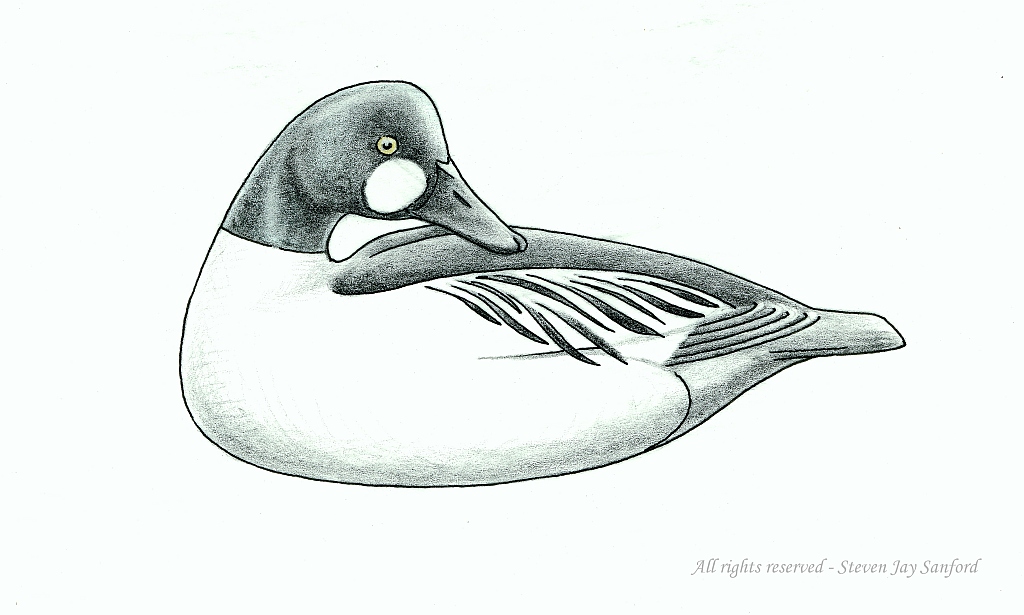 For these drawings I used ink and some pencils, including even a bit of colored pencil. My concept was to provide appropriate icons for a decoy contest at the Duckboat Show & Waterfowl Festival. We had started a decoy contest while the Show was still at Heckscher State Park, but I recall that these were drawn only after it had moved to Cedar Beach. The Goldeneye depicts a “Turnback Whistler” made by the famed Charles “Shang” Wheeler. Although he was from Connecticut, we Long Islanders can lay some claim to him – but only because he dominated the early U. S. National Decoy Contest – which was sponsored by the SSWA for most of its 70-year existence. His work was chosen to represent fancier – but still traditional – decoys.