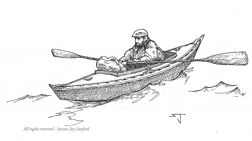 This double-ender is not one of the iconic Long Island duckboats but served its purpose nobly. It had plenty of rocker in the hull, so showing it in heavy seas only made sense. Mike Fishman is at the oars.