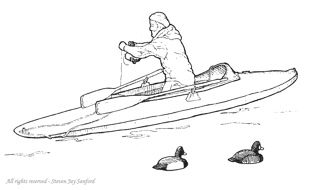 I drew this image in 1982, I think. I took a photo of myself – thatching my first duckboat in the driveway in East Islip. My immediate purpose was to provide a pertinent illustration for the annual Duckboat Show (only later was the “& Waterfowl Festival” appended) presented by the South Shore Waterfowlers Association (SSWA). Thatching the Grassboat has since been used on plates and clothing and the like.