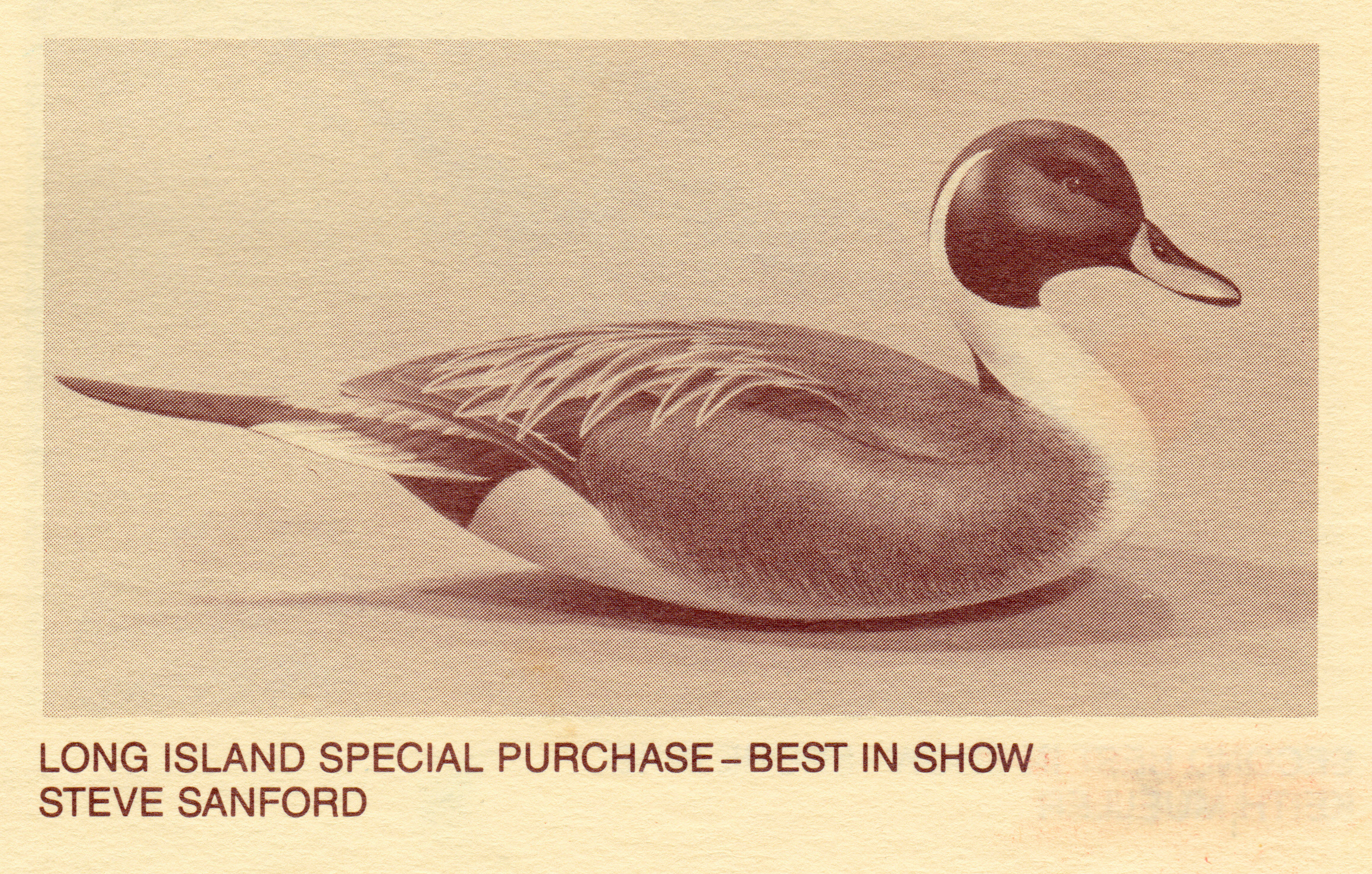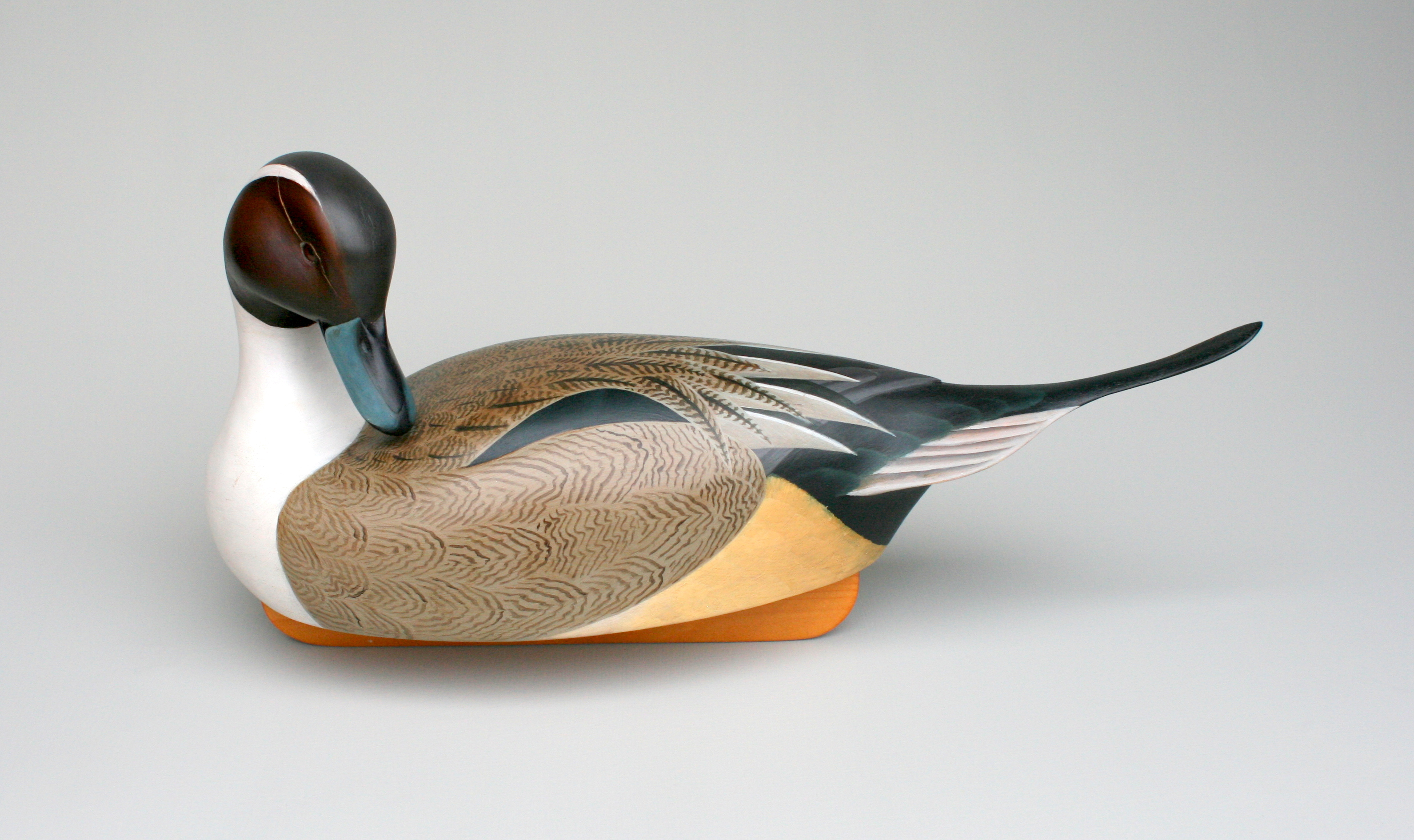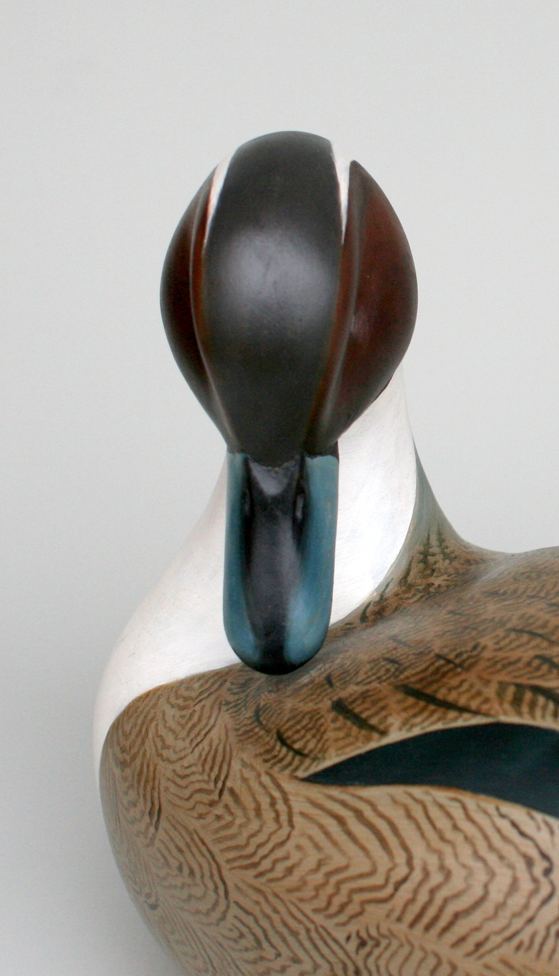 I think of this Drake Pintail as one of 2 quintessential Sanford decoratives – the Oldsquaw is the other “flagship”.  Both give me lots of opportunity to include my thoughts about form and line and curves and even color.  The difference, I suppose, is in the details.  More specifically, the difference resides in the intricacies of the patterns on the feathers.  It takes a lot of planning and work and fussing to get the look I want – but I really enjoy the Drake’s herringbone tweed cape.  And I insist that the tail feathers and their coverts reflect a perfect, geometric progression in size and aspect.  If I am successful, these details draw the viewer’s eyes ever closer.