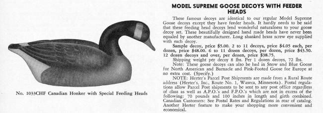 Ted took a liking to over-size decoys early on. He hunted over 7 of these balsa birds for many seasons – 6 Blacks and 1 drake Mallard. Sadly, they were all stolen sometime in the late 1960s. Note that Herter’s – being a midwestern company – called this species “Black Mallard” in its 1955 catalog.