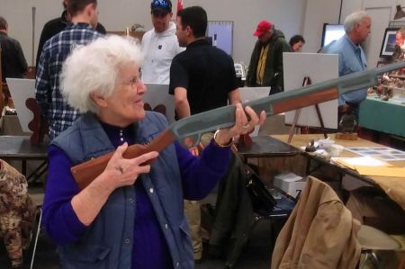 Many attendees were attracted to the TED SANFORD. Here my Mom is hefting a “special” Winchester Model 12 Featherweight. And, no, that is not an age spot on her hand. It was the inked-on decoy that showed she had paid her admission.