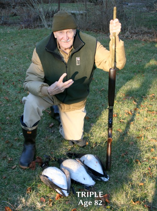 Ted made his last triple – 3 shots at 3 different birds – when he was 82 years old. On his last waterfowl hunt – January of 2011 – he made a nice double on Brant – one hard right and one hard left. He was 85.
