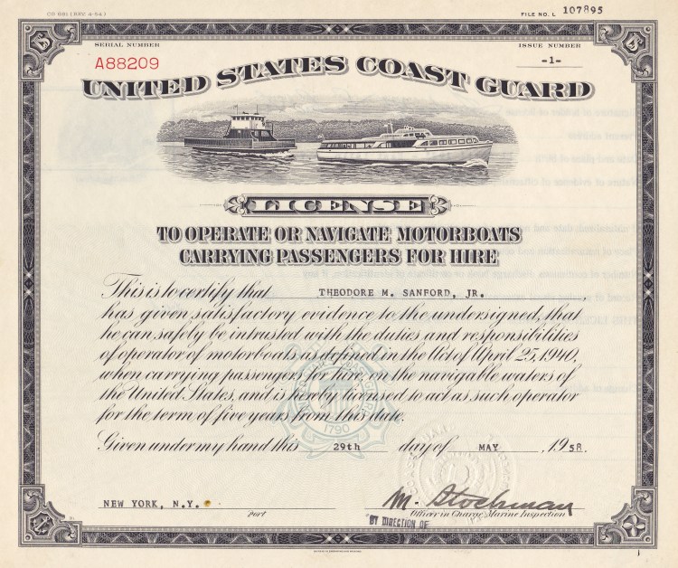 Ted knew his way around boats. Right after WW II, he sailed his Gaff Sloop SNOOTY out of Champlin’s Creek. He held a Captain’s License when operating the State cruiser out of Fire Island (later Robert Moses) State Park. And he built and owned numerous vessels throughout his life. He used the State cruiser (below) to take my Mom to Southside Hospital for my birth in July 1953.
