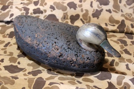 This Atlantic Coast model cork Black Duck was made in either Old Saybrook or Quogue. Ted hunted 10 of them for many years. He never re-painted or re-sealed them. So – as with many cork decoys – they began to take on water during a long day’s hunt. One was never recovered because it “sank at its mooring” during one hunt – and was not missed until it was too late.